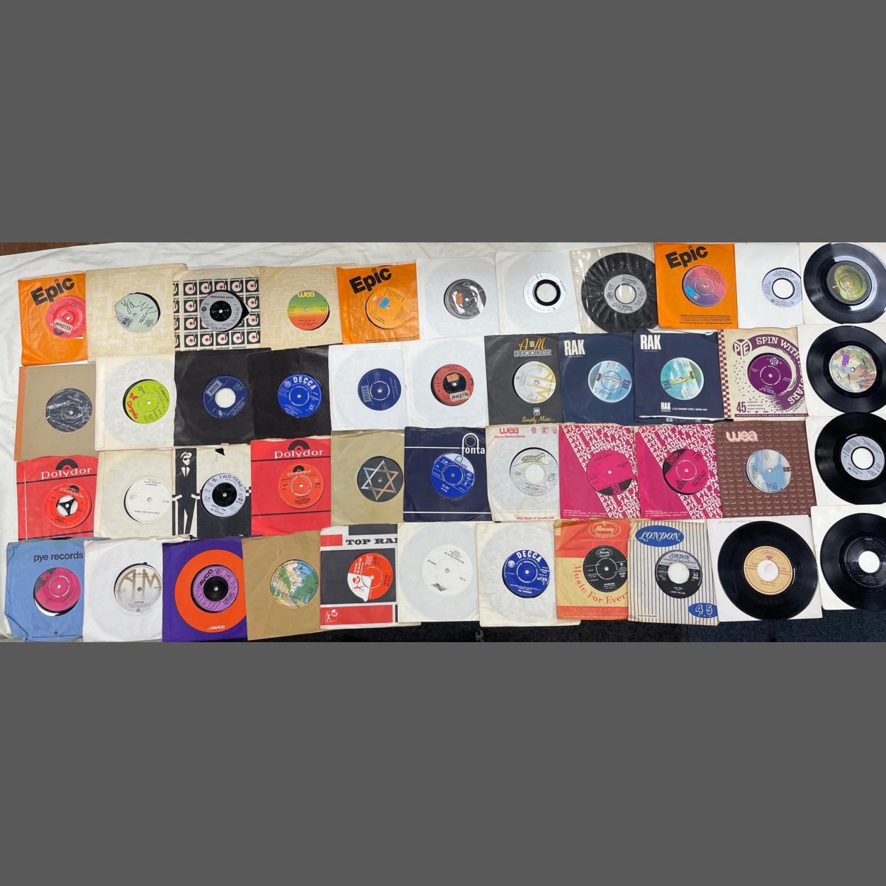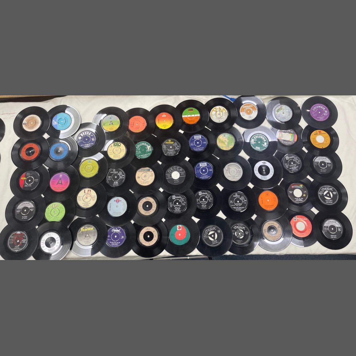A substantial collection of over 100 sleeveless 45rpm vinyl records from a variety of recording labels including RSO, UNITED ARTISTS, PYE, DECCA, EMI, and COLUMIA among others from the 1960s and 70s and including artists such as Mireille Mathieu, Mud, The Marmalade, Carol Freeman, Alvin Stardust, The Checkmates, and The Seekers among many others.