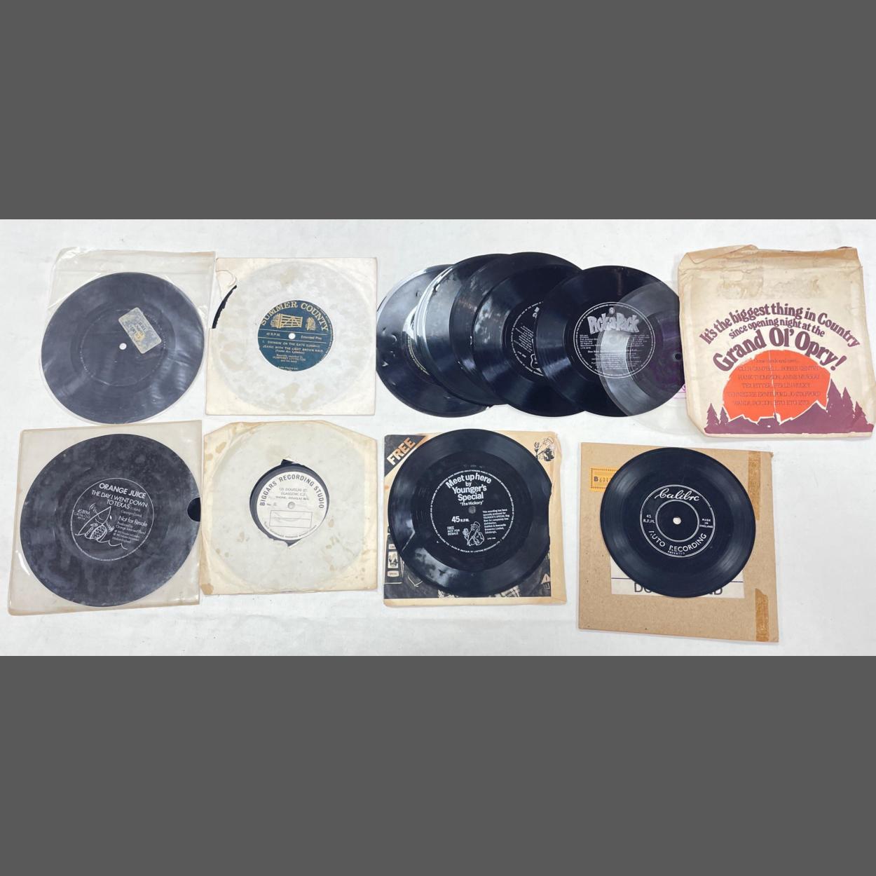 For those afficionados interested in 45rpm / 33 1/2rpm FLEXI-DISCS - a collection of 13 discs from various artists including Orange Juice, The B.B.C. Gnome Service, Pick-a-Pack, The World of Country Music, A Hundred and One Headline Hits among others. AN ADDED BONUS of a CALIBRE AUTO RECORDING disc - popular in the 1950s/60s as homemade acetates recorded within minutes in AUTO RECORDING BOOTHS. Of historical value. AND A FURTHER BONUS of a BIGGARS RECORDING STUDIO (Glasgow) Acetate auto recording disc. Again, of historical value.