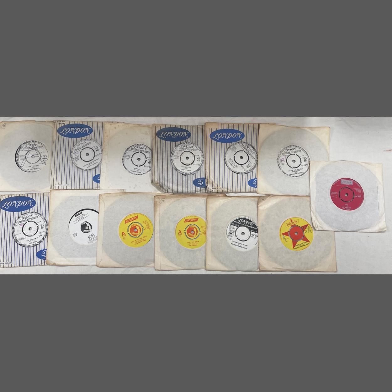 An interestingly valuable selection of 13 LONDON / LONDON AMERICAN RECORDINGS INCLUDING WHITE, STAR and BIG SOUND - Demonstration Sample Not For Sale - 45rpm vinyl records from the 1960s and 70s. The selection includes single Demos and Demos plus respective released discs. Artists include The Chartbusters, Hodges, James and Smith, and Van Duren among others.