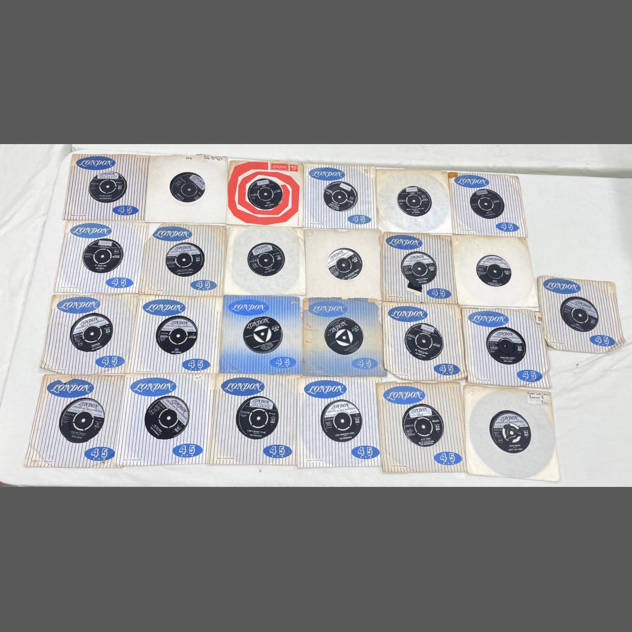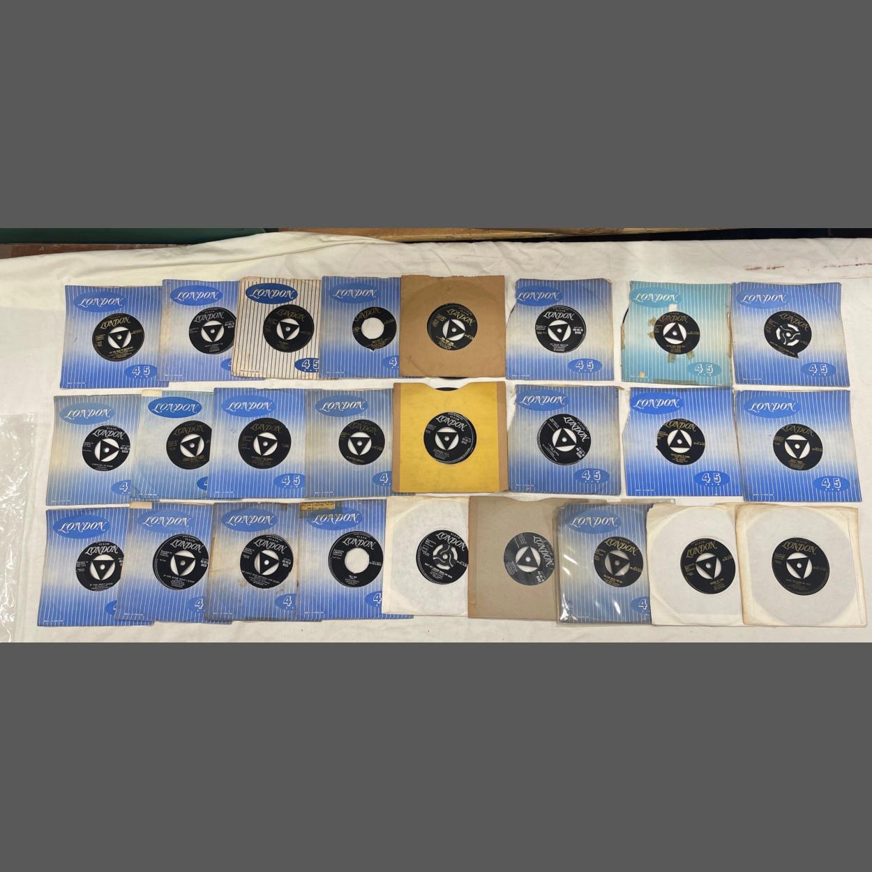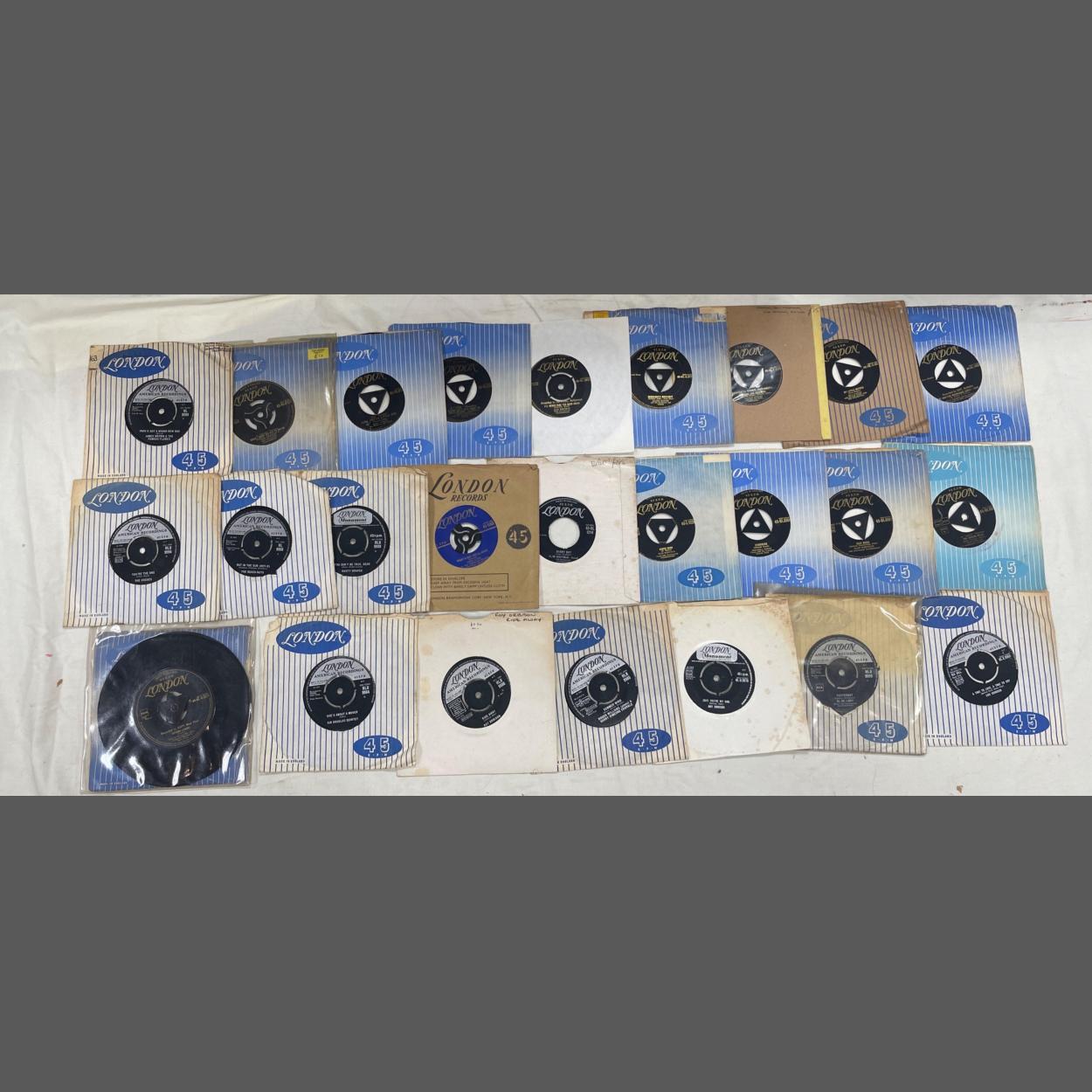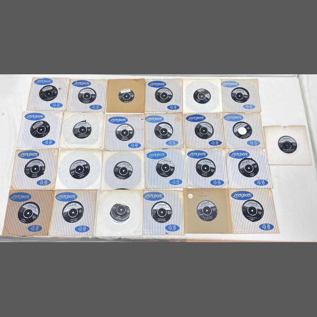 An eclectically interesting selection of 25 LONDON / LONDON AMERICAN RECORDINGS 45rpm vinyl records from the 1960s to include Julie London, Slim Whitman, Little Richard, and Pearl Bailey among many others.