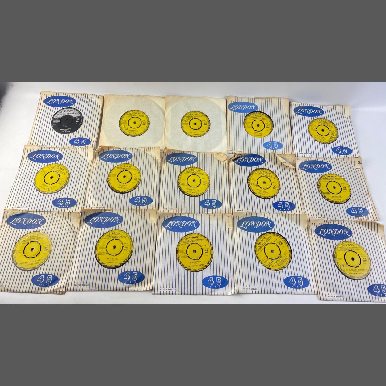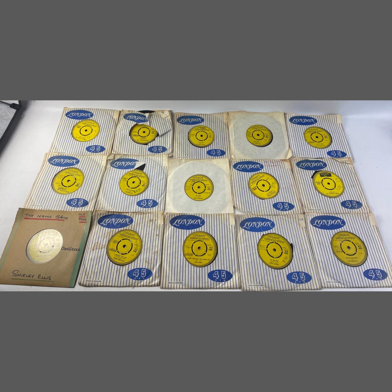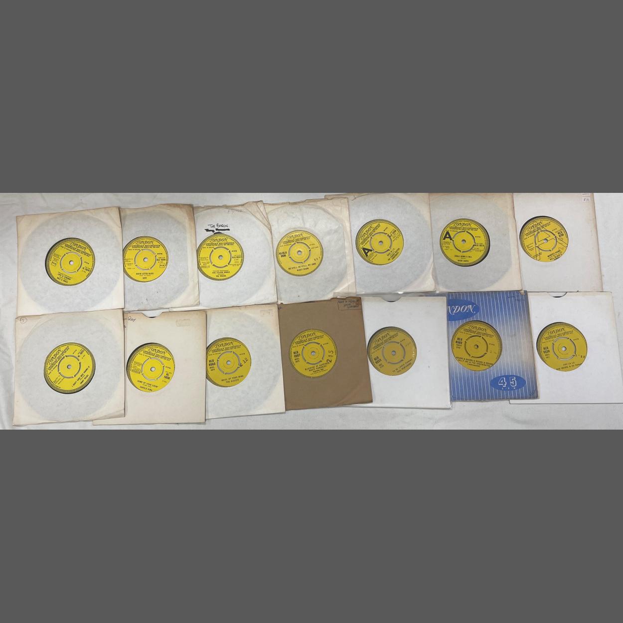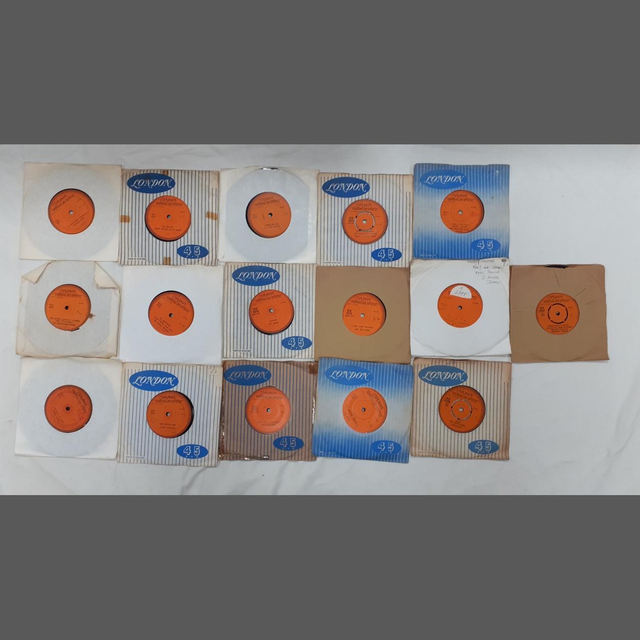 An interestingly valuable selection of 15 LONDON AMERICAN RECORDINGS YELLOW LABEL including LONDON MONUMENT - Demonstration Sample Not For Sale - 45rpm vinyl records from the 1960s PARTNERED with their respective release disc to include The Dixibelles, Joe Perkins, a rare Wade Ray (HL9700) and many others.