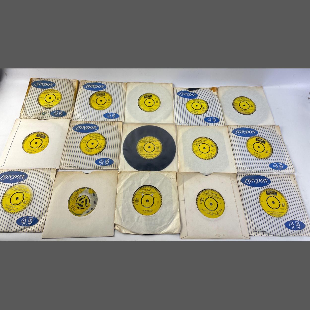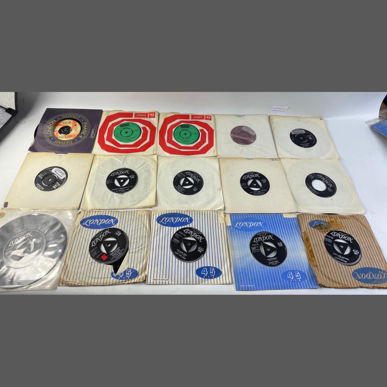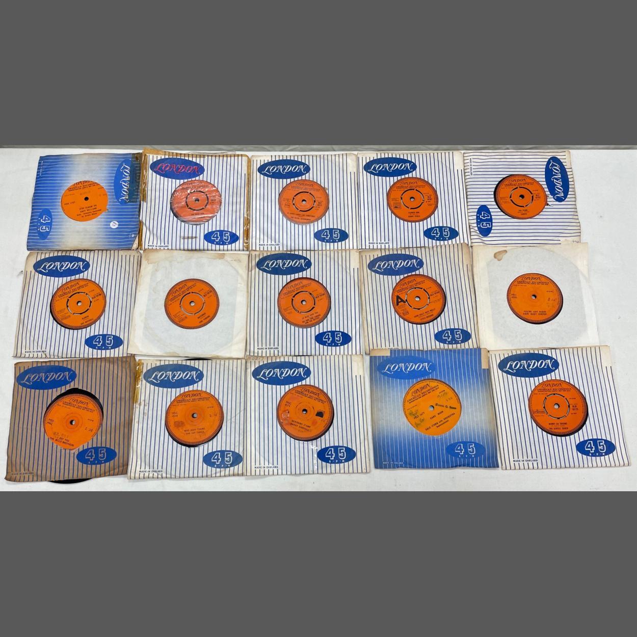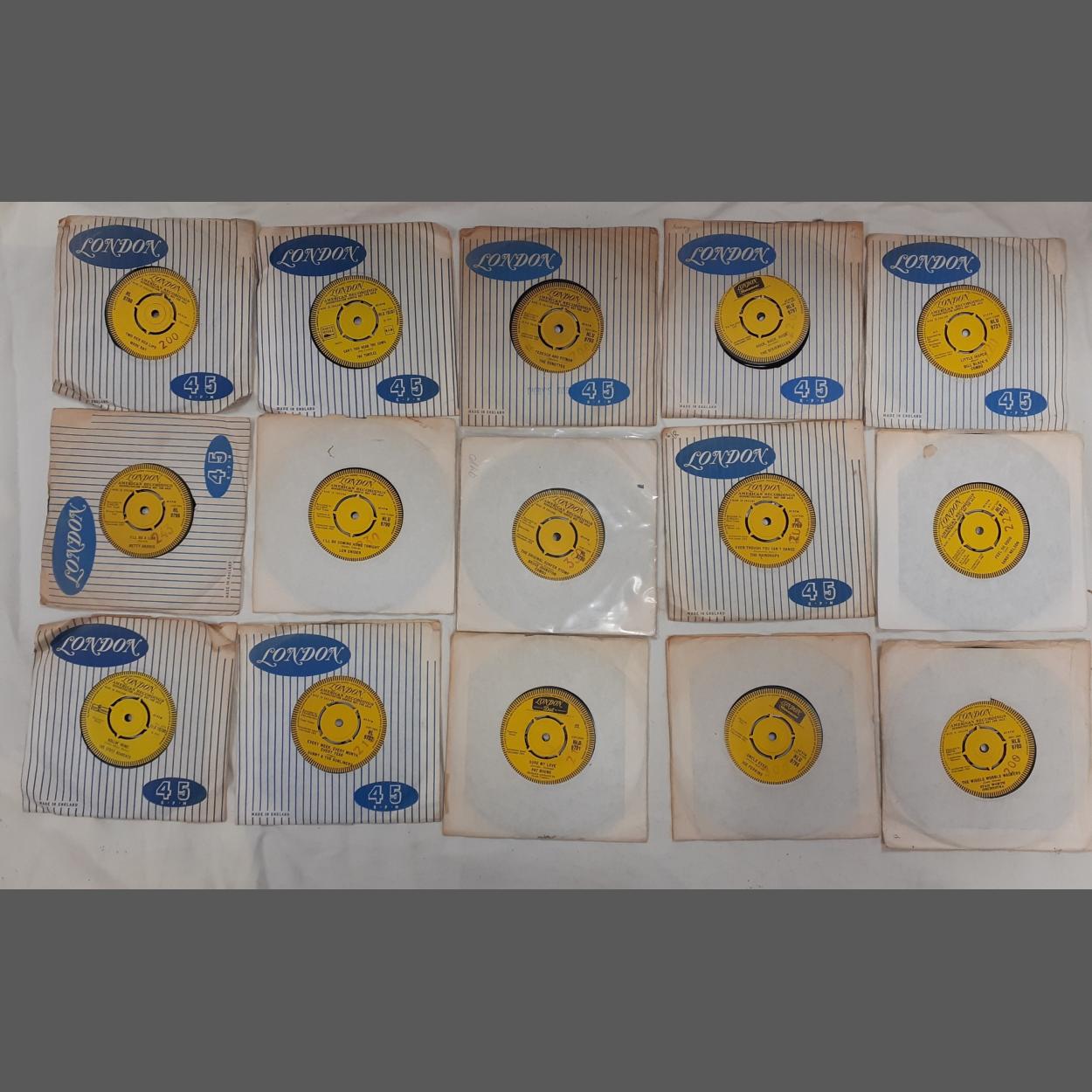 An interestingly valuable selection of 15 LONDON AMERICAN RECORDINGS YELLOW LABEL including LONDON MONUMENT - Demonstration Sample Not For Sale - 45rpm vinyl records from the 1960s PARTNERED with their respective release disc to include The Dixibelles, Joe Perkins, a rare Wade Ray (HL9700) and many others.