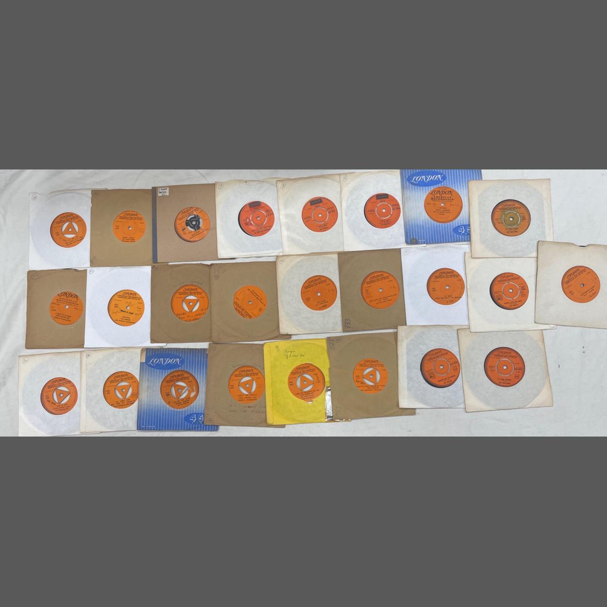 An interestingly valuable selection of 15 LONDON AMERICAN RECORDINGS ORANGE LABEL - Demonstration Sample Not For Sale - 45rpm vinyl records from the 1960s PARTNERED with their respective release disc to include Mitchell Torok, Jack Scott and The Chantones, Ritchie Valens, a rare Savannah Churchill (HLW9273) and many others.