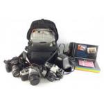 Four cameras. CANON EOS KISS with 18-55mm lens. OLYMPUS OM10 IN CASE, PENTAX K1000 and a boxed POLAROID POGO printer