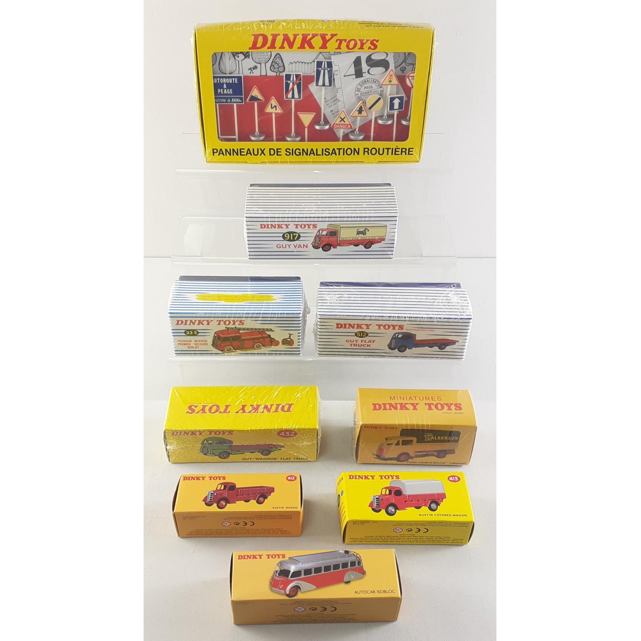 A collection of cellophane wrapped ATLAS EDITIONS of DINKY TOYS to include Guy Flat Truck (512), Fire Engine (32E), Covered Wagon (917), Guy "Warrior" Flat Truck (432), Ford Camion Bache (25JJ), and a set of road signs (593). Also unsealed boxed Austin Wagon (412), Austin Covered Wagon (413) and Autocar Isobloc (29E)