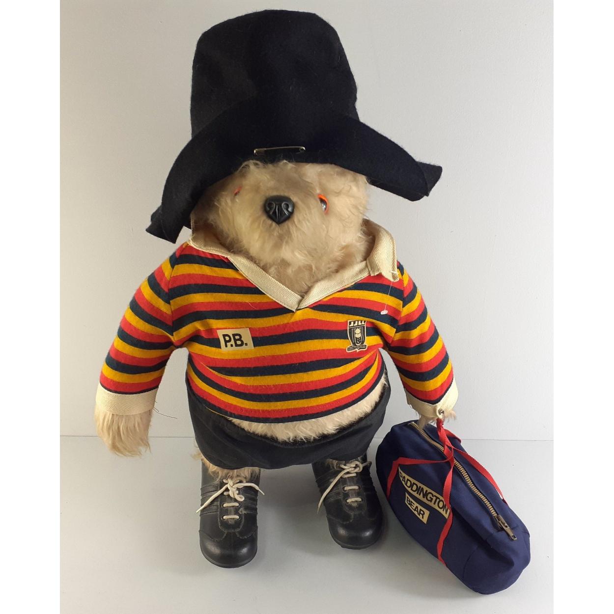 A hand-made in England by GABRIELLE DESIGNS (1972), Paddington Bear in rugby kit with kitbag and boots. Stands approx 50cm tall.