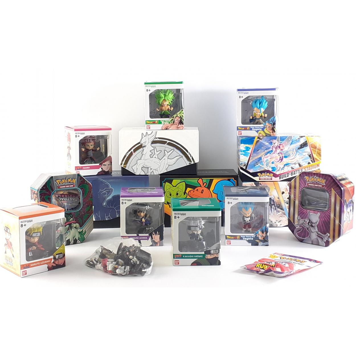 POKEMAN tins with some loose cards and a selection of ChibiMasters models in boxes.