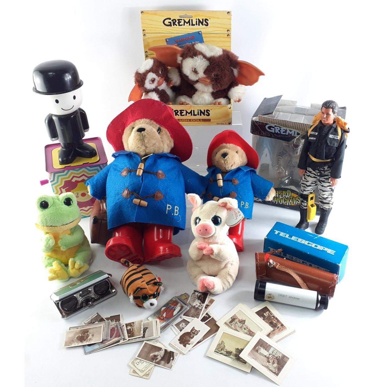 Mixed box of great toys to include two Paddington Bears, Gremlins (don't let them get wet), and others.