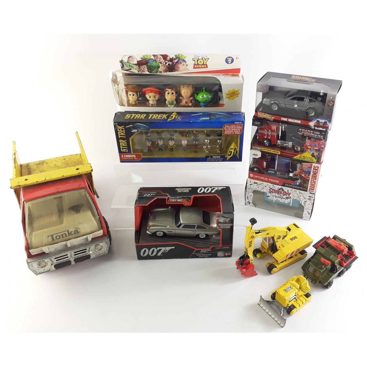 Mixed lot of toys to include TONKA tipper, boxed Back To The Future models, OO7, Scooby Doo van, Star Trek, Toy Story and others. Lots of interesting pieces,.