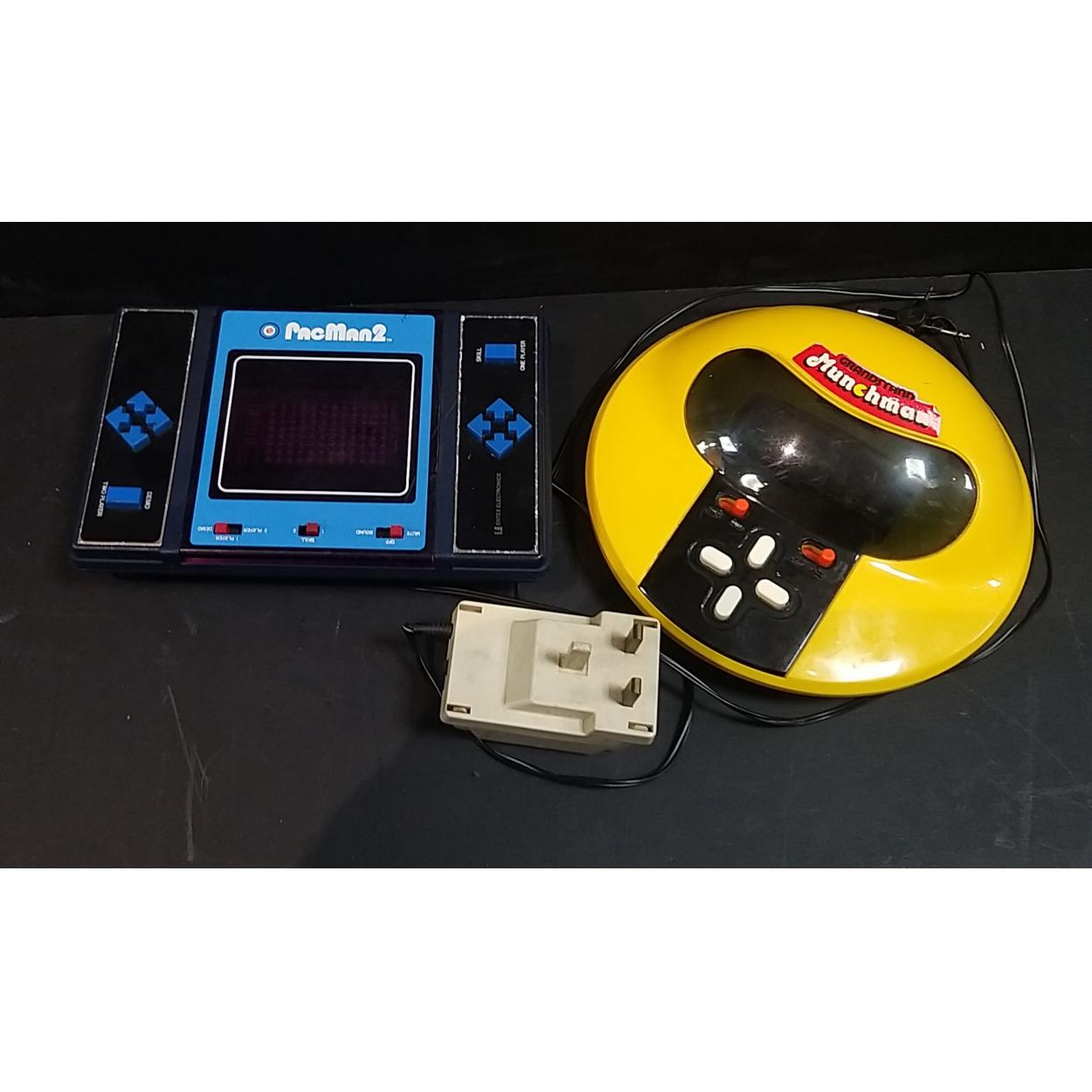 VINTAGE Tomy Grandstand Munchman 1981 Vintage Electronic Arcade Game - Age Level 8-16 Years approx - country of origin Japan - tested as partially working(comes on when you press the on button, and doesn't stay on when released - probably a simple repair! AND A vintage PacMan 2 electronic game tabletop handheld Entex 1981 - country of manufacture Taiwan - tested as working Both items have a shared power cable that fits