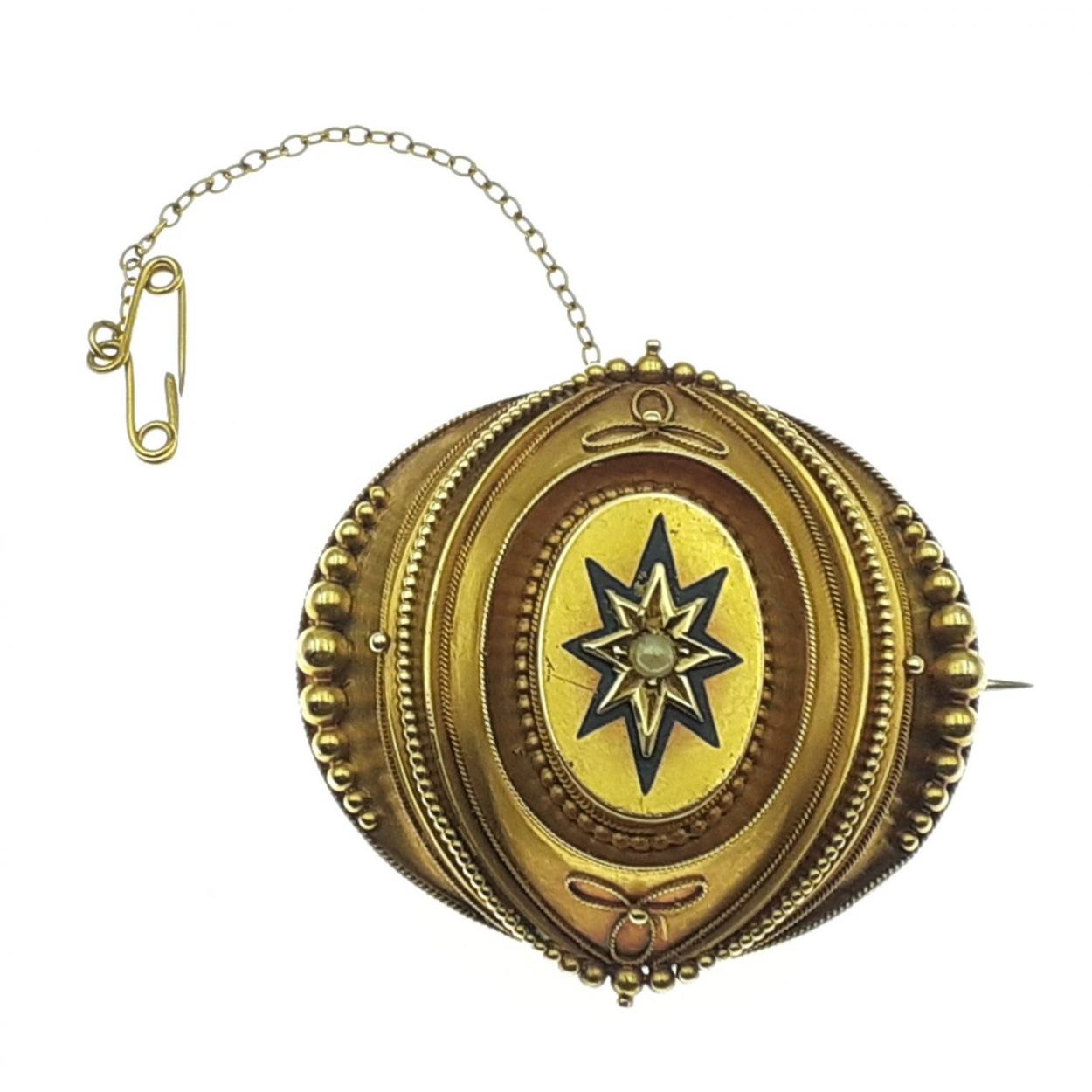 An ornate VICTORIAN 19th century unmarked yellow metal mourning brooch with central pearl, possibly 9kt, but could be 15kt, but alas no stamp - sold as described - weight gross 12.22g approx - dimensions width 4.5cm x height 4.5cm approx century.