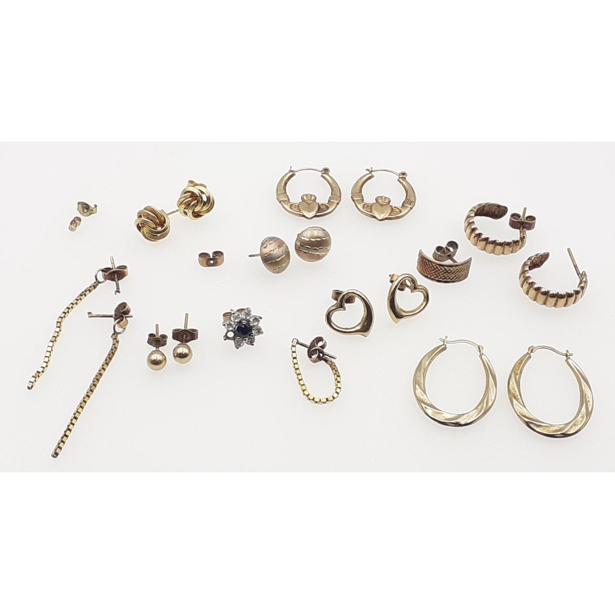 Five 9ct stamped earrings. Weight 2.1g approx plus a quantity of unmarked yellow metal earrings