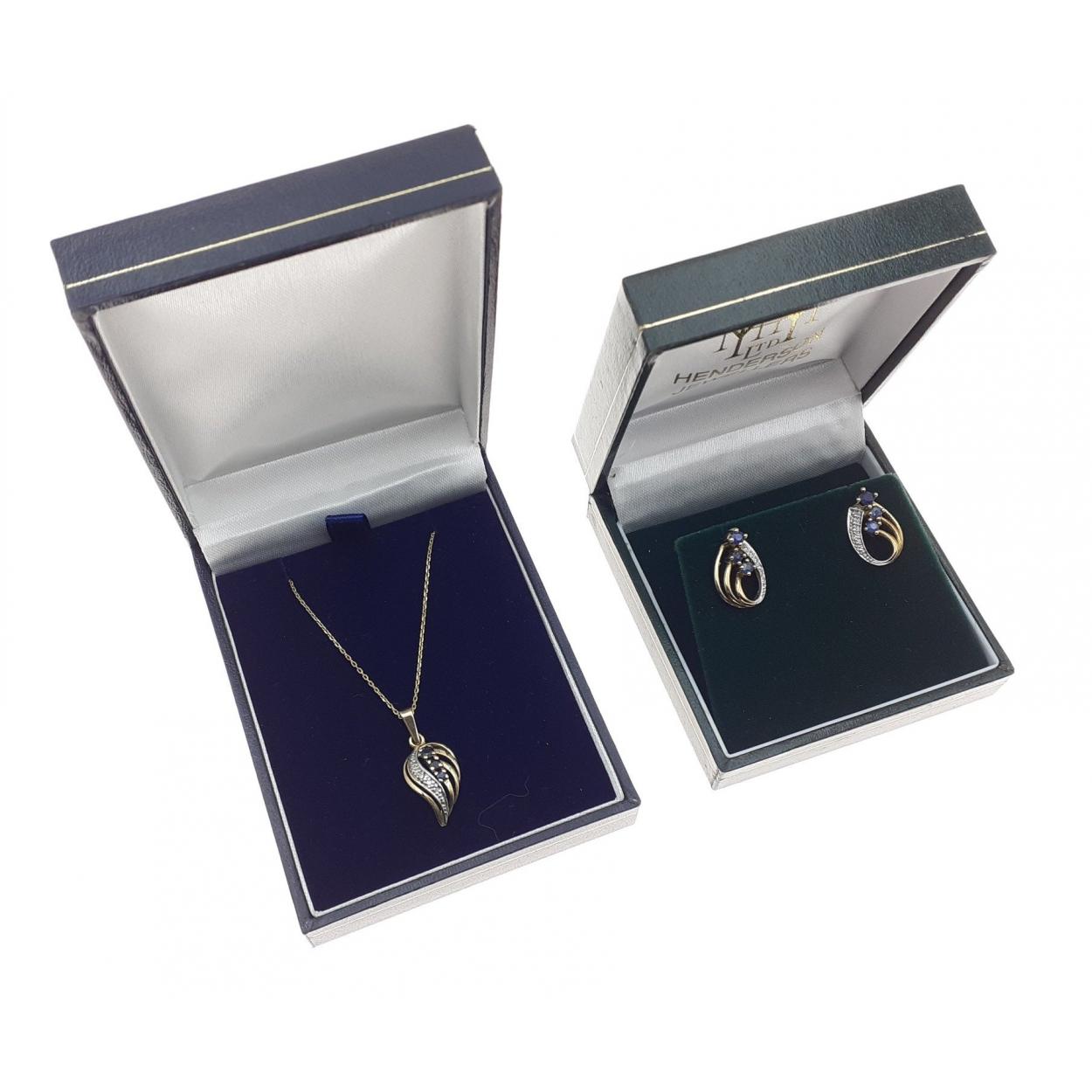 Beautiful 375 stamped pendant and earring set each with sapphires and small diamond chips. Gross weight 4.7g approx