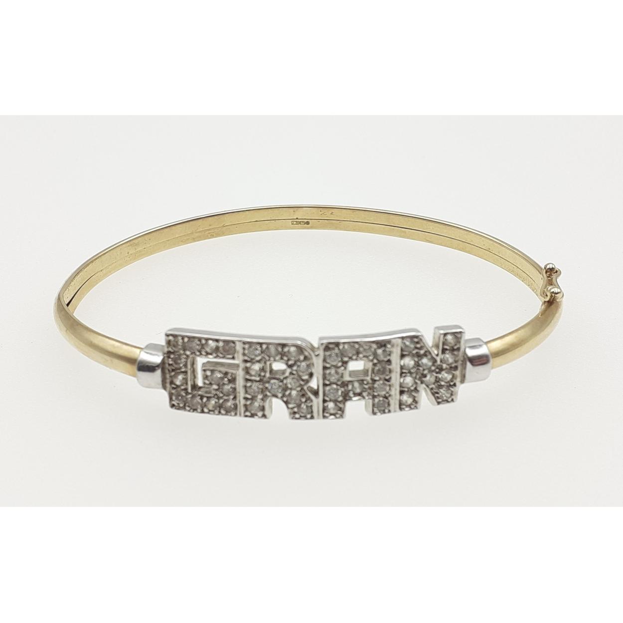A 375 stamped bangle with central GRAN picked out in clear white stones. A lovely sentimental BLING! piece. Gross weight 7.9g approx