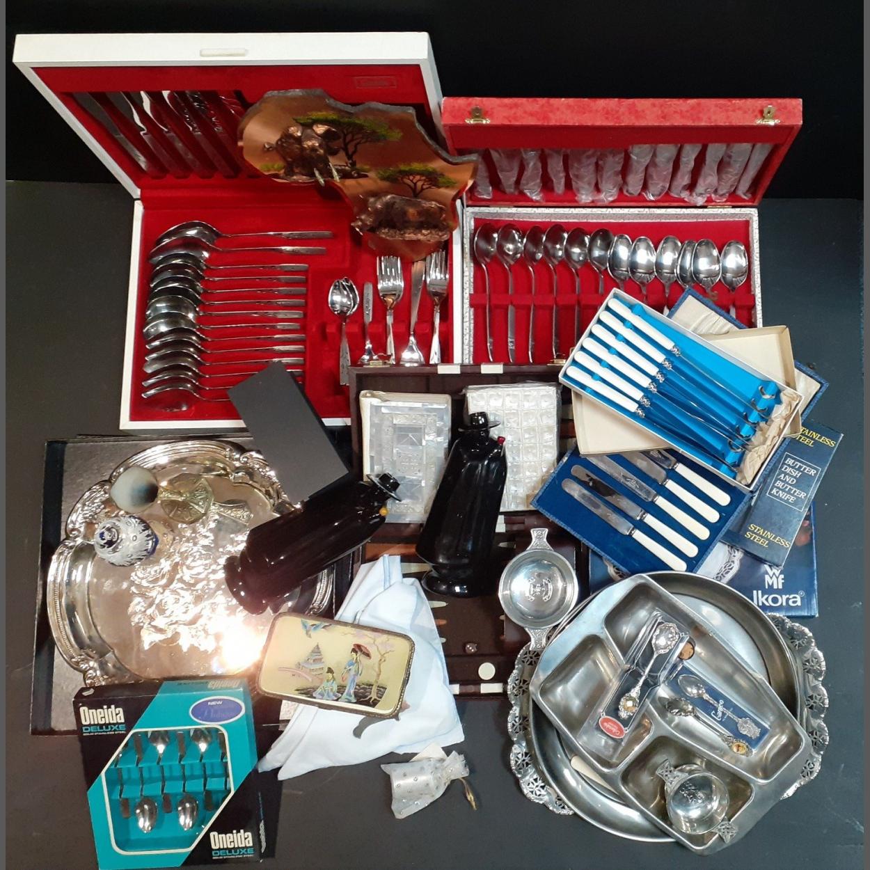 A lot of plated flatware comprising wooden ONEIDA canteen, other flatware, serving dishes and other decorative items.