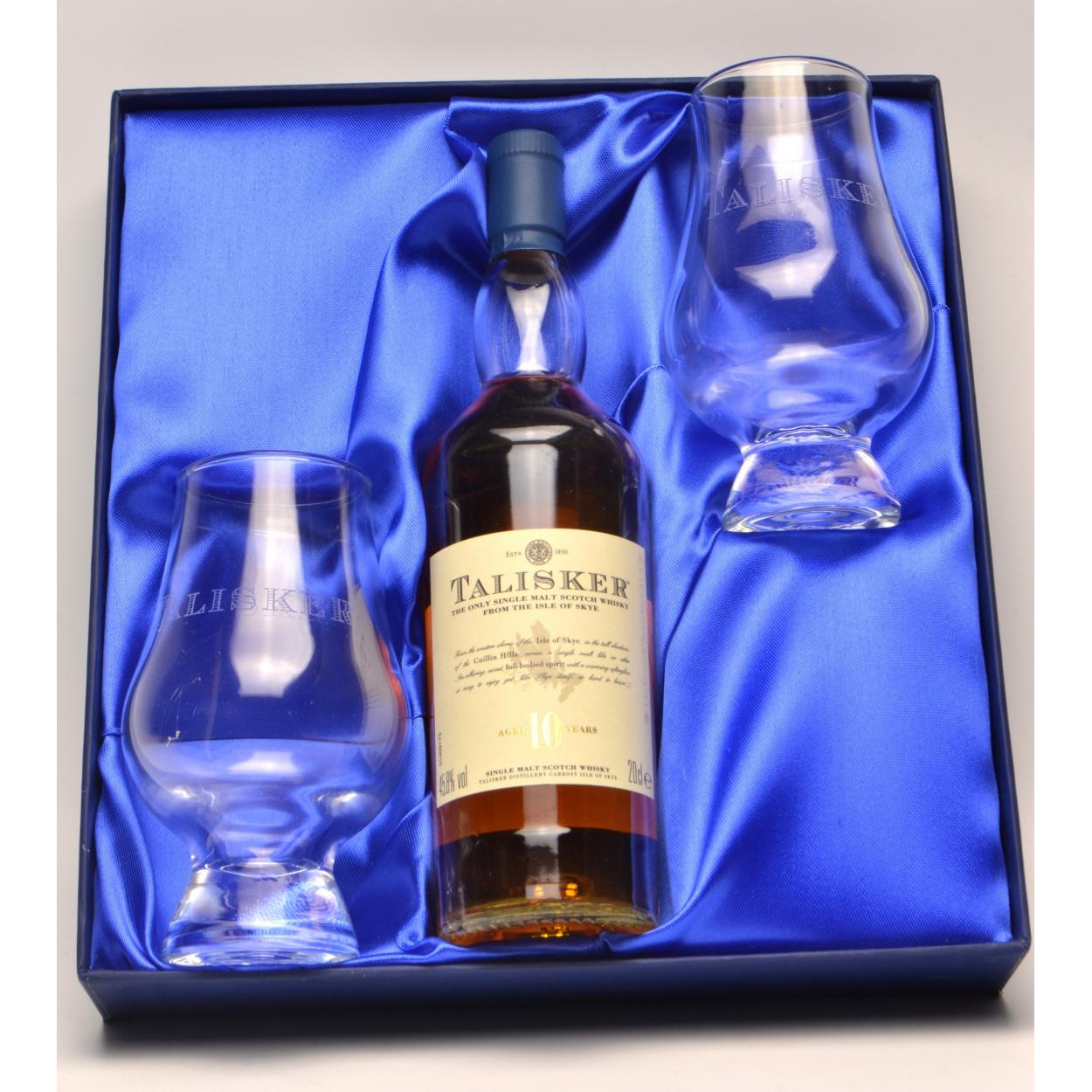 TALISKER GIFT PACK 20cl with two beautiful matching glasses within their blue presentation box - AN IDEAL GIFT FOR THE CONNOISSEUR ! - seal intact - good condition - All came from a passionate whisky collector's collection! The item is sold as described and we do not accept liability for the state of the closure or the taste of the contents.
