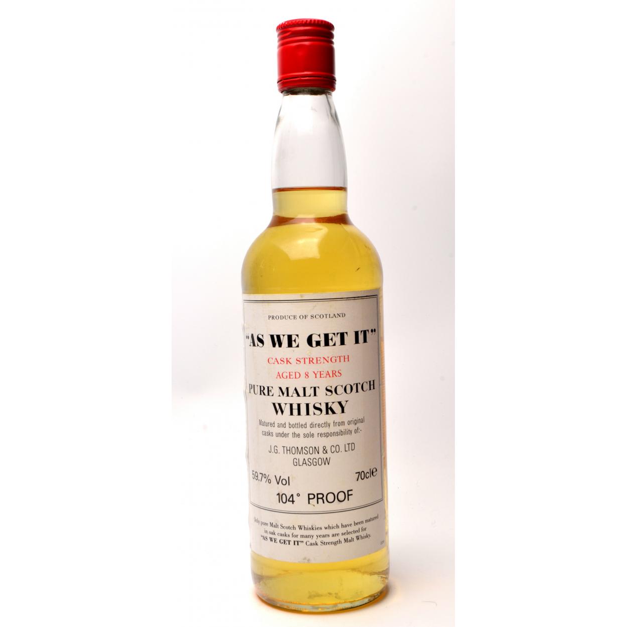104 104 104 104 104 PROOF PURE MALT SCOTCH WHISKY ‘ AS WE GET IT' by JG Thomson Co Ltd GLASGOW - SEAL INTACT - bottle was originally 75cl but sadly was stored on its side and has leaked - from base of bottle to to top of whisky level measures 14.5cm - but WHO CARES!! It's still 104 104 104 104 proof!! Bottle from a reputable family - bottle sealed - and in good condition. Bottle came from a passionate whisky collector's collection. The item is sold as described and we do not accept liability for the state of the closure or the taste of the contents.