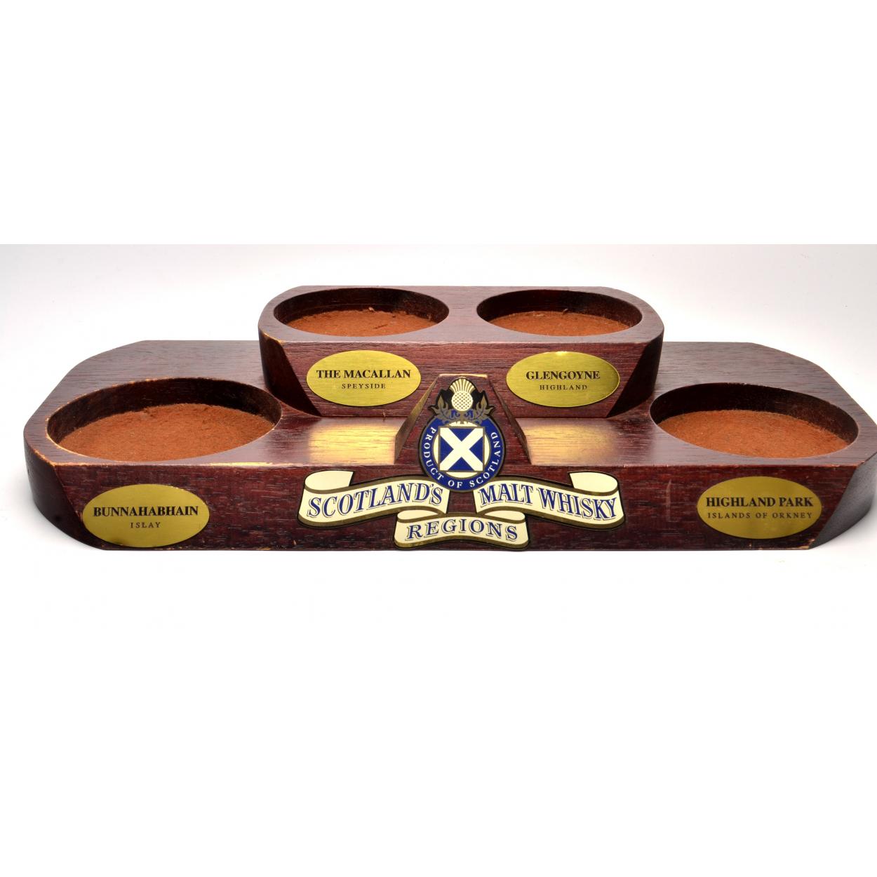 'SCOTLANDS' MALT WHISKY REGIONS STAND/PLINTH which holds the four great bottles to include Bunnahabhain 12 Year Old 70cl, The Macallan 10 Year Old Malt, Glengoyne 12 Year Old Malt and lastly Highland Park 12 Year old 70cl. The item is sold as described and we do not accept liability for the state of the closure or the taste of the contents.
