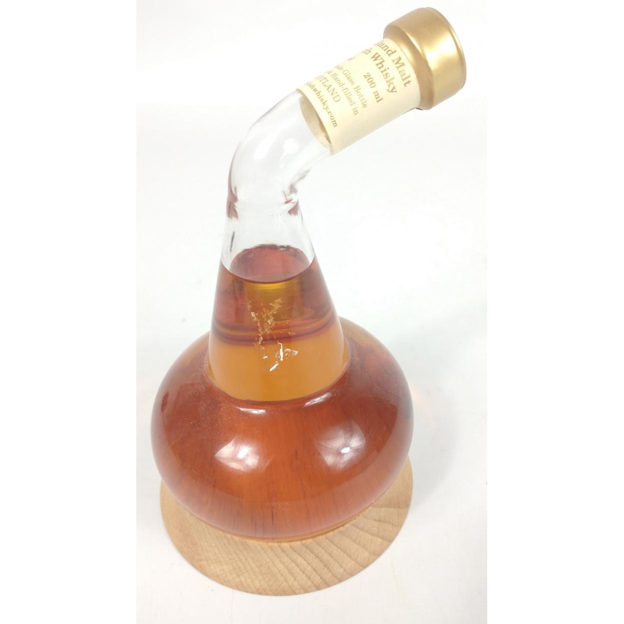 An unusual still shaped hand-blown bottle on a wooden plinth containing 200ml of 4-% vol Highland Malt Scotch Whisky. The item is sold as described and we do not accept liability for the state of the closure or the taste of the contents.