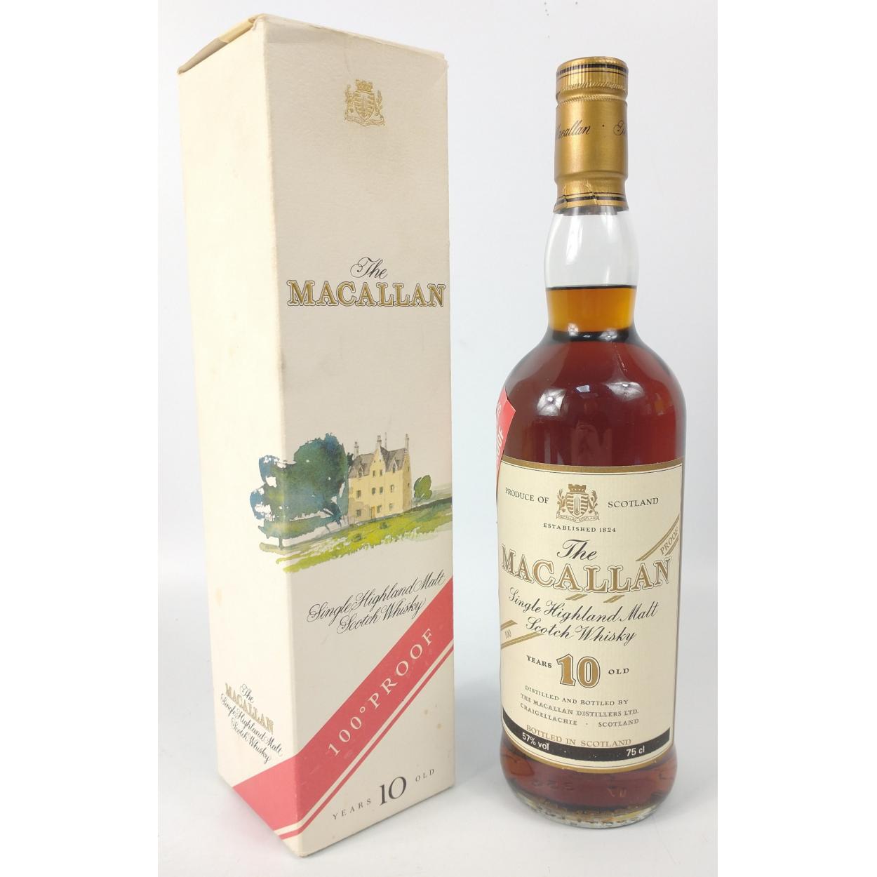 MACALLAN - A boxed bottle of 100 PROOF Macallan 75cl purchased in June 1990 - the box is worn but intact, an old piece of sellotape is attached to the top of the box, and the vendor has written in ballpoint the date of purchase on the inside lid - this bottle seal remains intact and the bottle label 100 proof has a very slight dog ear on one side - the original price paid on the shop label on the bottle top was £20.15 from Cockburn and Cockburn Edinburgh! The item is sold as described and we do not accept liability for the state of the closure or the taste of the contents.
