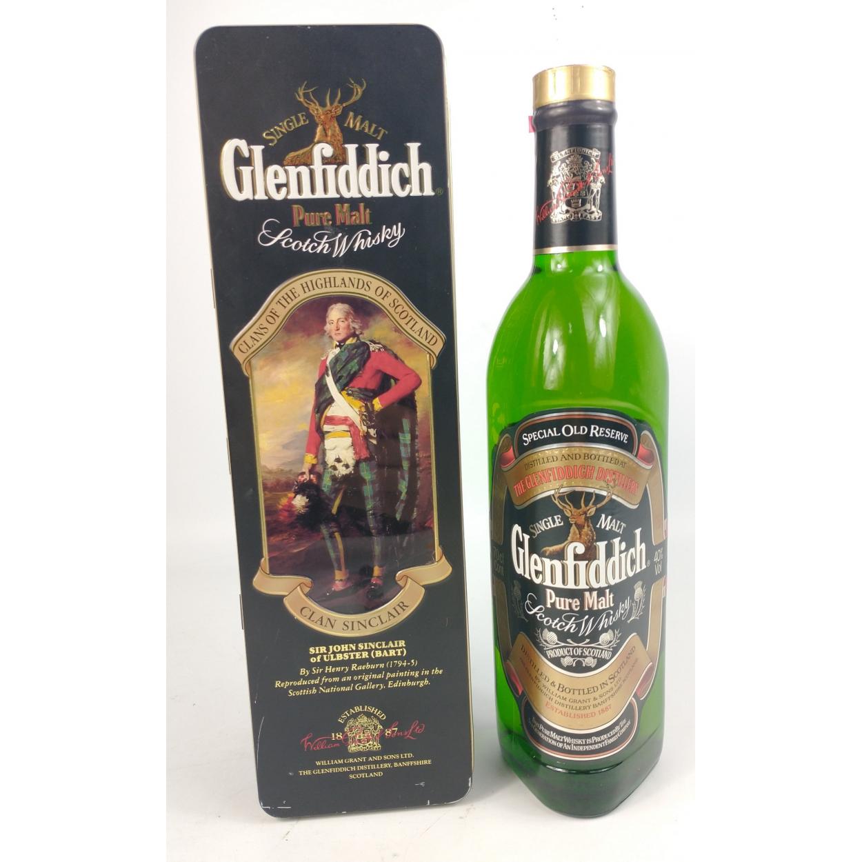 GLENFIDDICH Sir John Sinclair Of Ulbster (Bart) 70cl bottle of Pure Malt Scotch Whisky celebrating Clans Of The Highlands of Scotland Collection series - bottle in a 'as new condition' and seal intact - the tin is in very good condition with the odd scratch. The item is sold as described and we do not accept liability for the state of the closure or the taste of the contents.