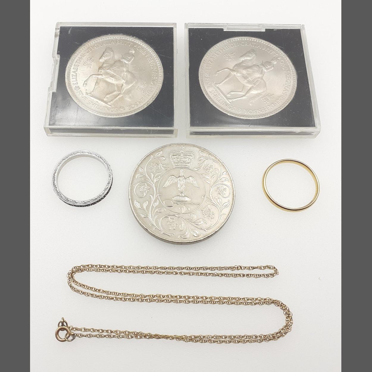 Four Crown coins, an unmarked ring and an unmarked chain and a silver ring.