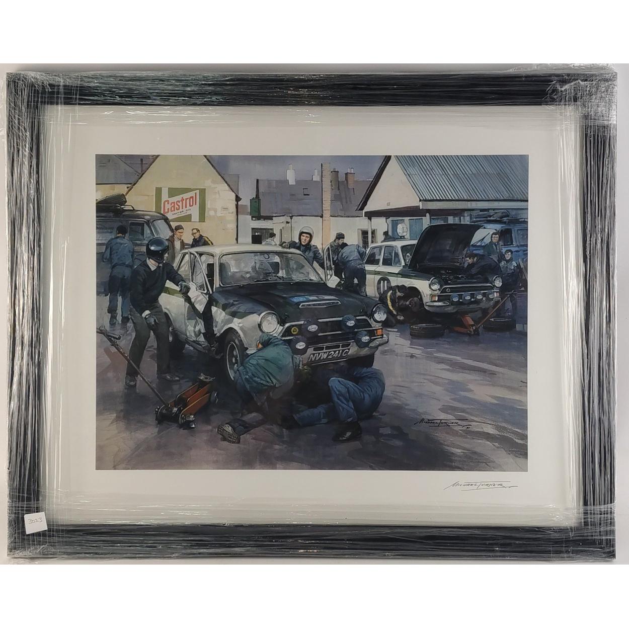 JIM CLARK Motor racing Interest Art print. A beautiful framed print of borders Legend and F1 World Champion JIM CLARK. Signed print by Michael Turner. Depicts Cortina with mechanics during 1966 RAC Rally, with historically accurate damage shown to the Cortinas door. Printed on high quality heavyweight paper Frame size 60cm x 48cm. A stunning piece ready to hang.