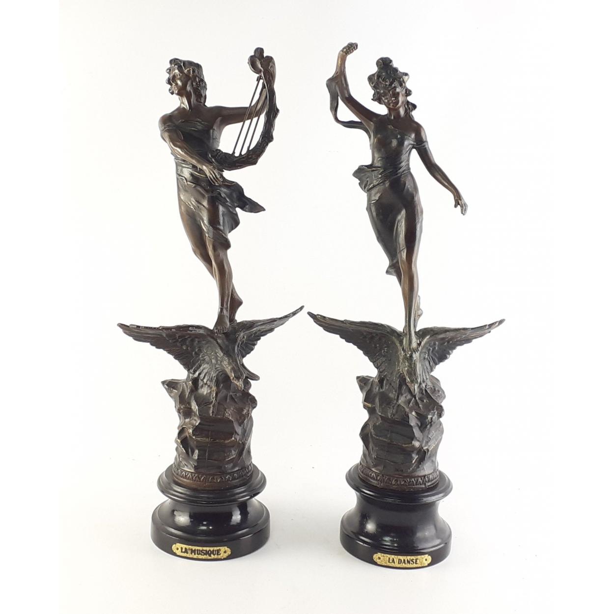An impressive pair of spelter figures LA MUSIQUE & LA DANSE. Each 46cm approx and in good condition. Minor damage to tips noted.