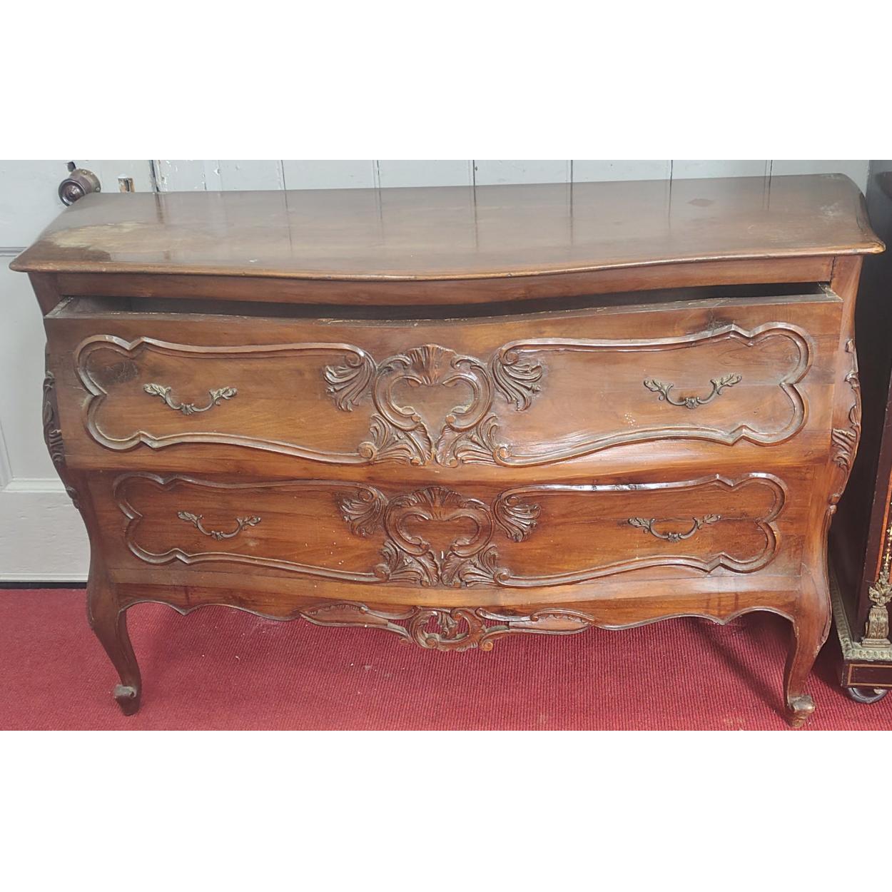 A two drawer bow front chest of drawers with lovely scroll work detail. Came from a substantial property in Italy. 125cm x 45cm x 84cm