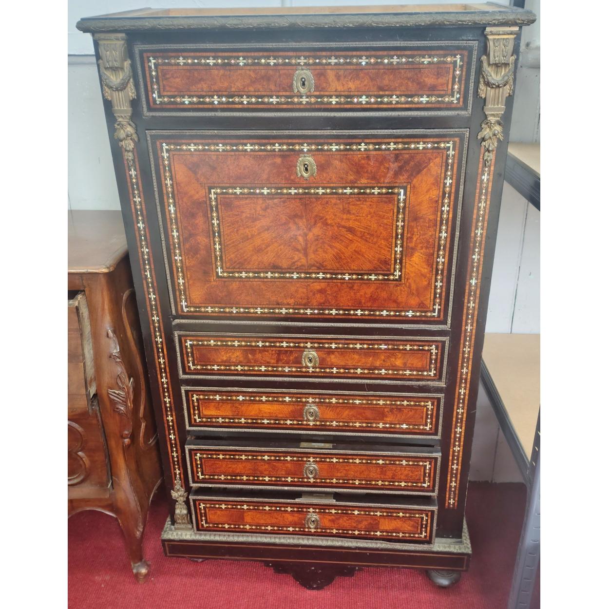 A superb stylish secretaire cabinet in the Napoleon III style with beautiful inlay. 70cm x 35cm. Note the top had had a marble slab but this is missing and the bottom left foot is detached but present. A wonderful piece with real presence.