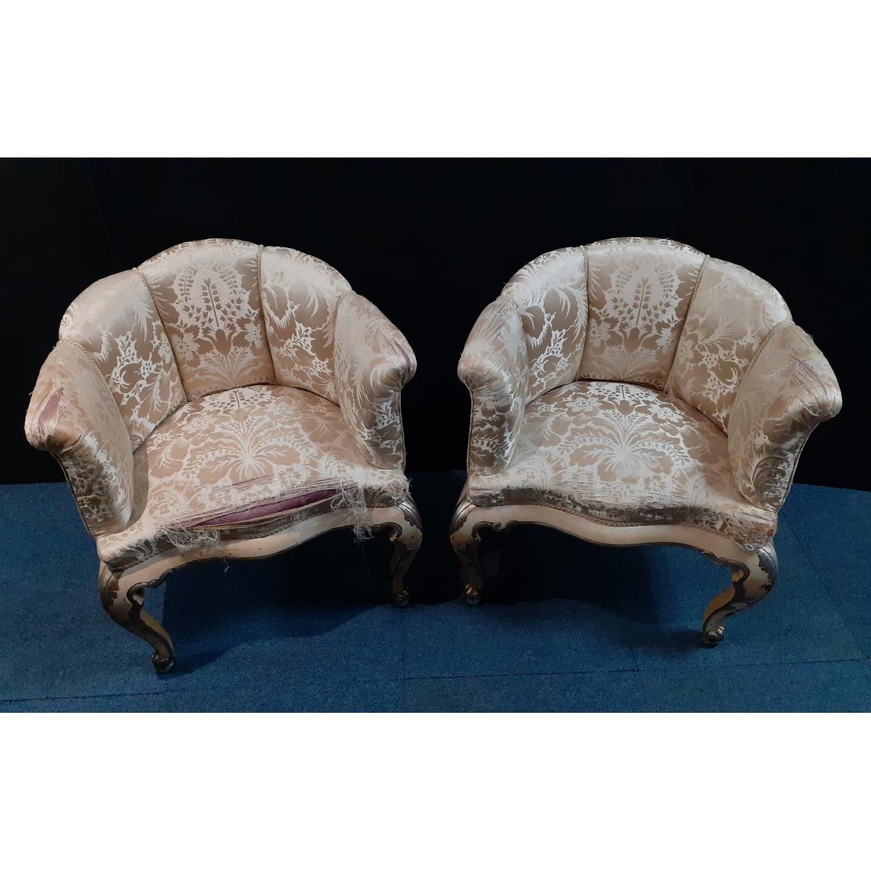 A pair of charming early 20th century Louis XV style armchairs in shabby chic look. With wear to finish and covers. A great basis for a restoration.
