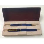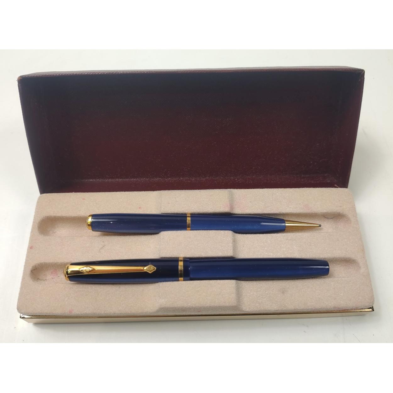 A CONWAY STEWART box with unmatched 54 small blue irridescent pair. 14ct Gold nib to fountain pen.