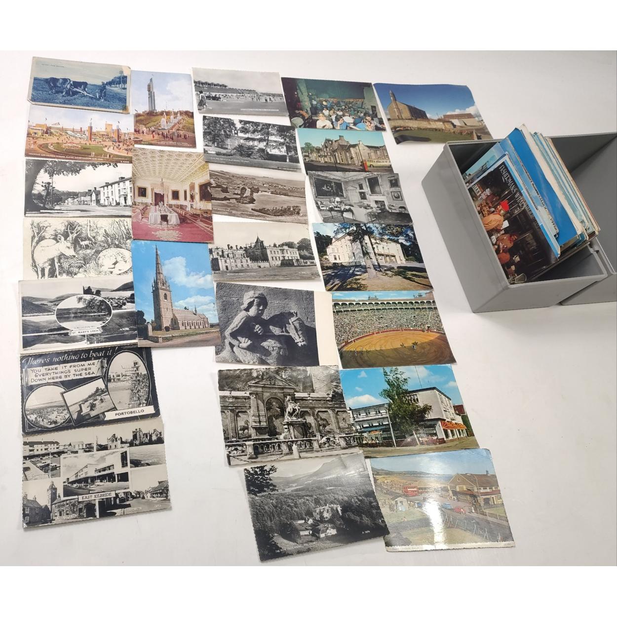 A plastic small storage box with a quantity of postcards. Mainly post war colour.