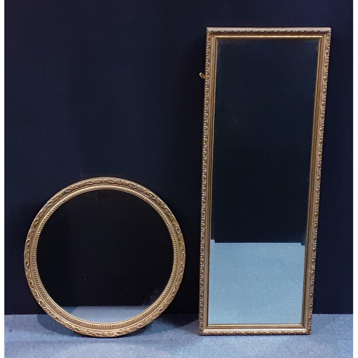 Two useful mirrors in good condition. A rectangular one 95 x 35cm and the circular has a 50cm diameter.