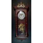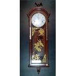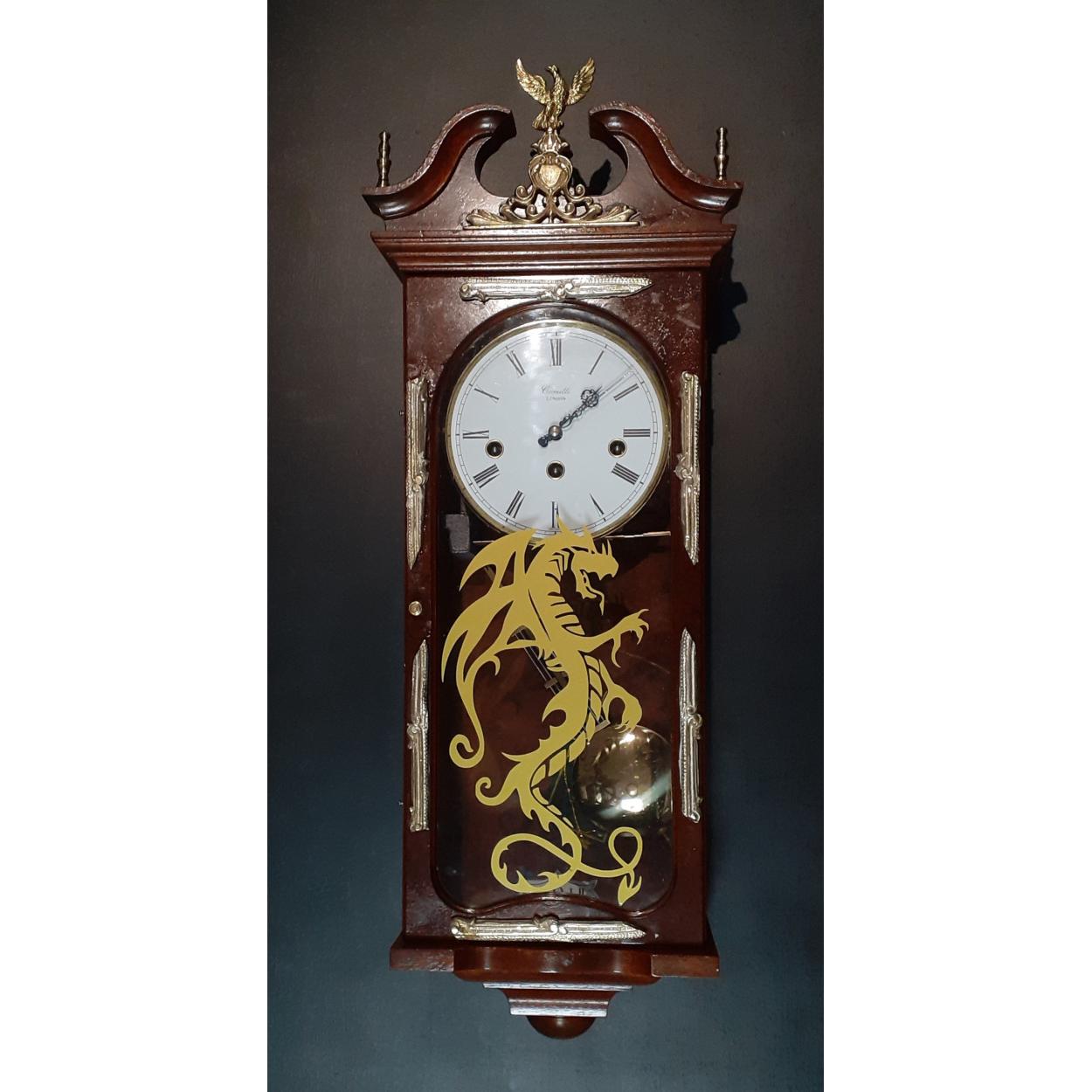 A modern 'VINTAGE' style wood wall clock. With pendulum, no key. Untested. 55cm tall.