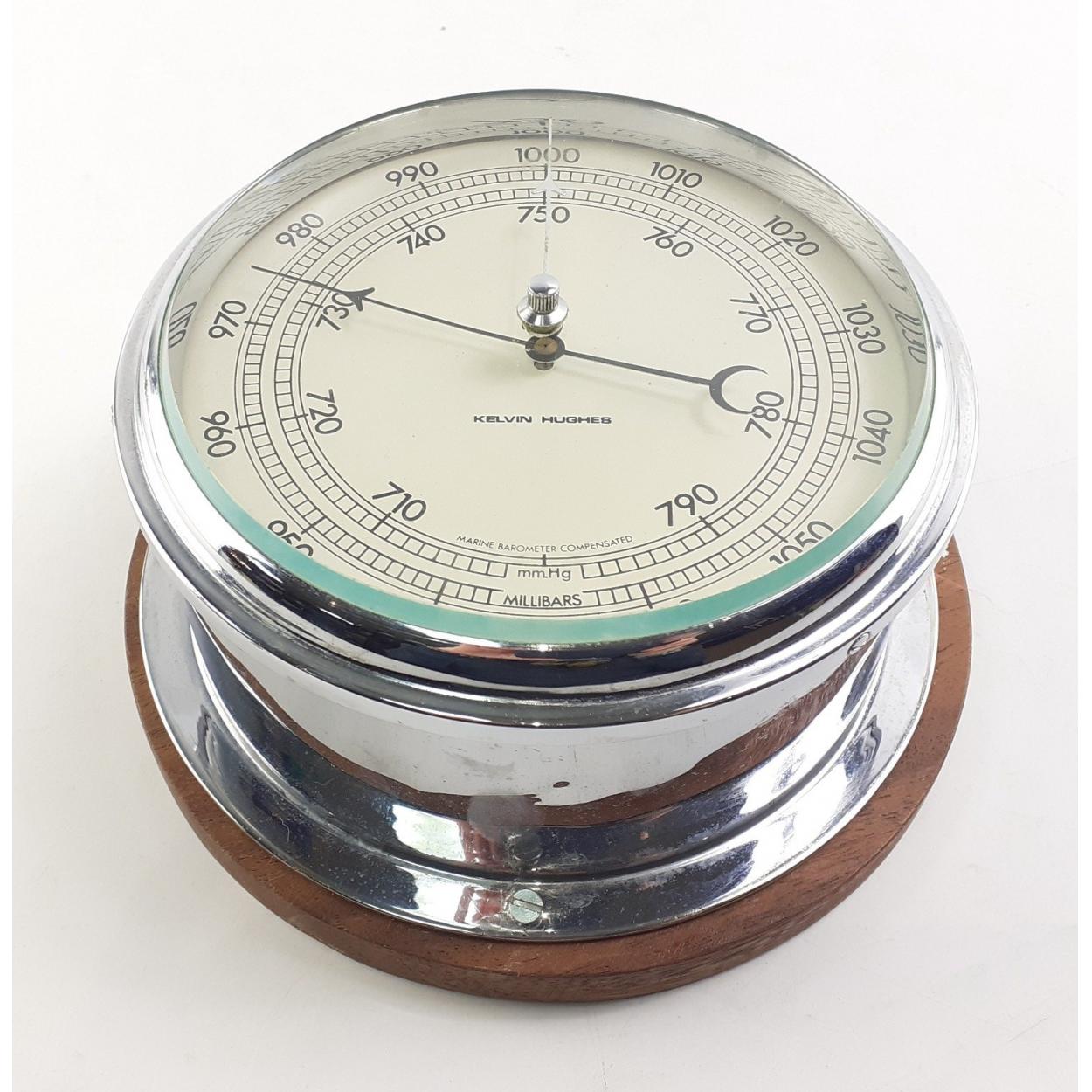 A Kelvin Hughes Marine barometer on newer plinth 15cm bevelled glass fascia. A good piece.