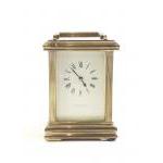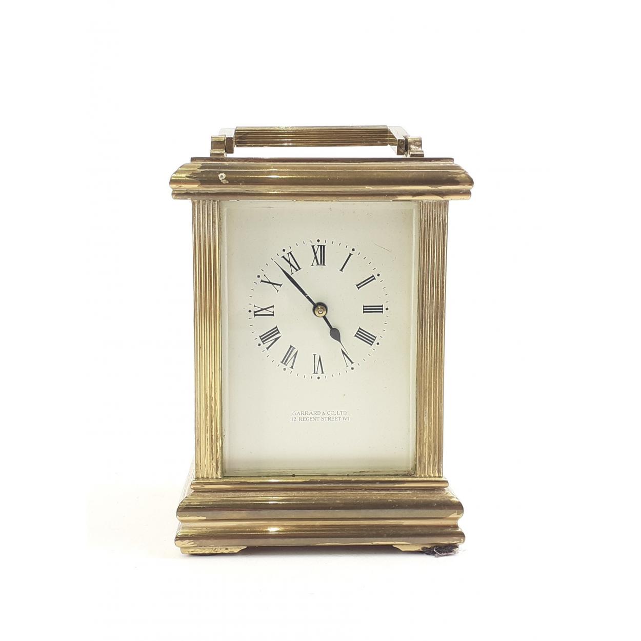 A GARRARD & Co. brass carriage clock. 14cm tall. Stylish piece. Rear door handle missing and some rubbin to the brass. Untested, no key.