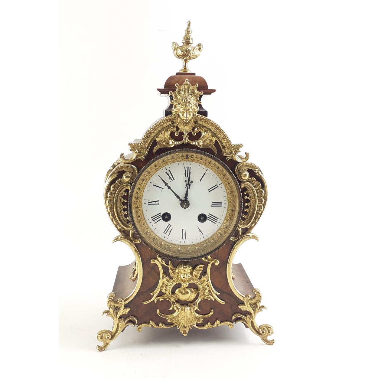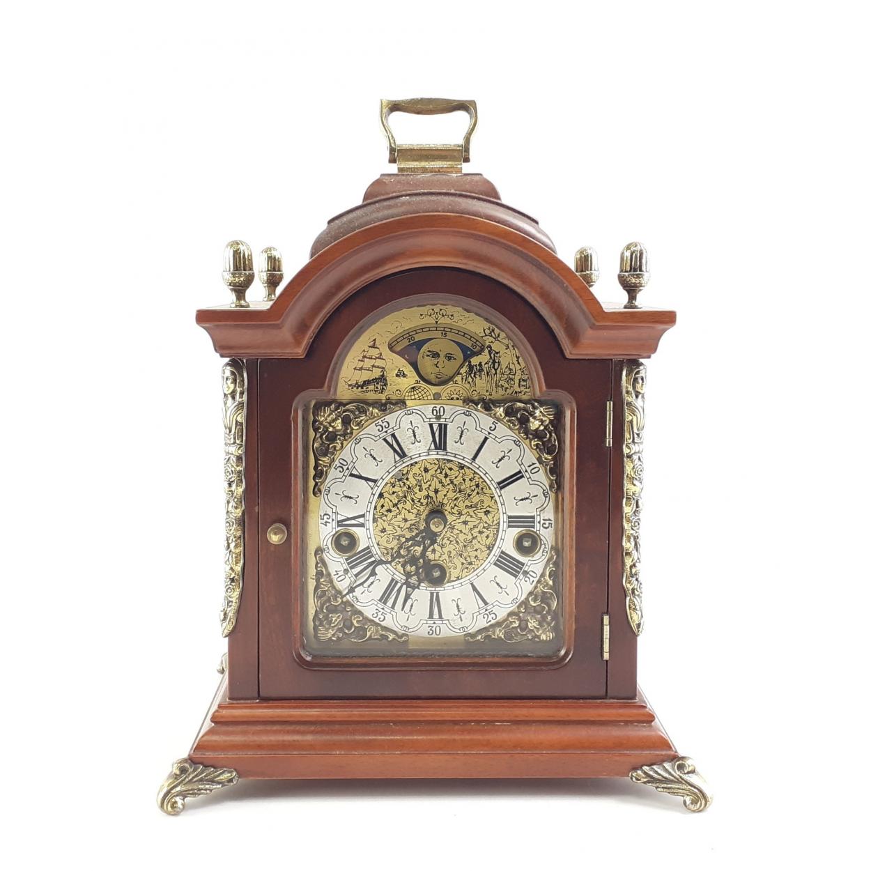 An ornate German made brass movement mantle clock.Quarter Chime, no key. Stands 30cm approx.