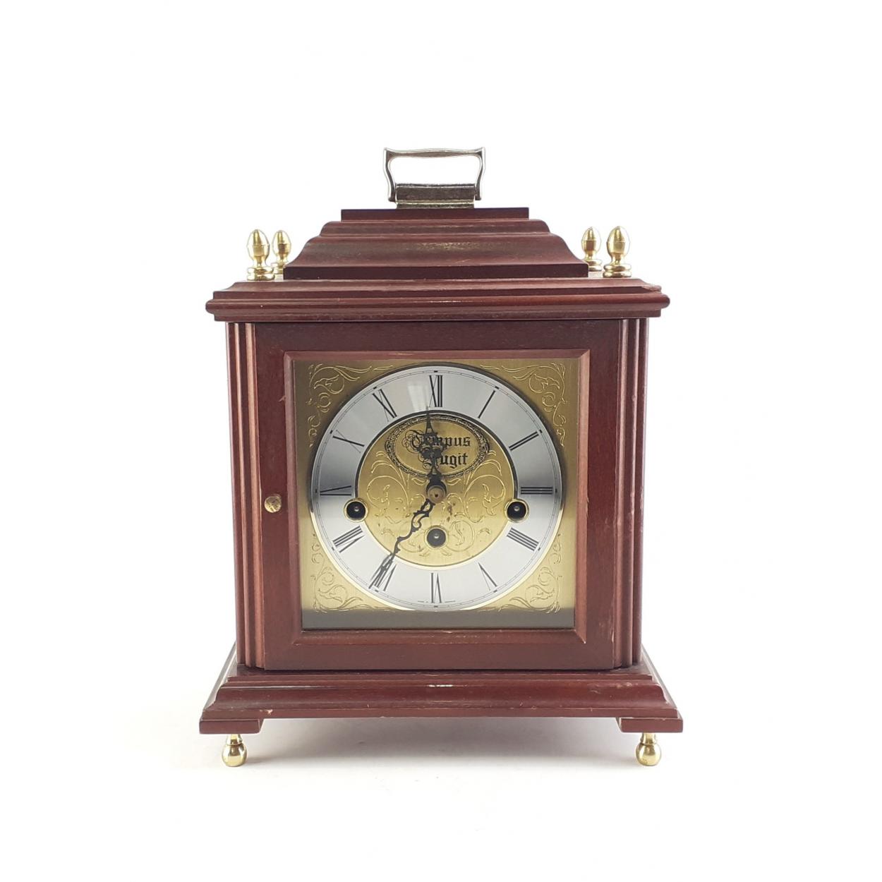 A TEMPUS FUGIT wood case mantle clock standing 28cm tall.