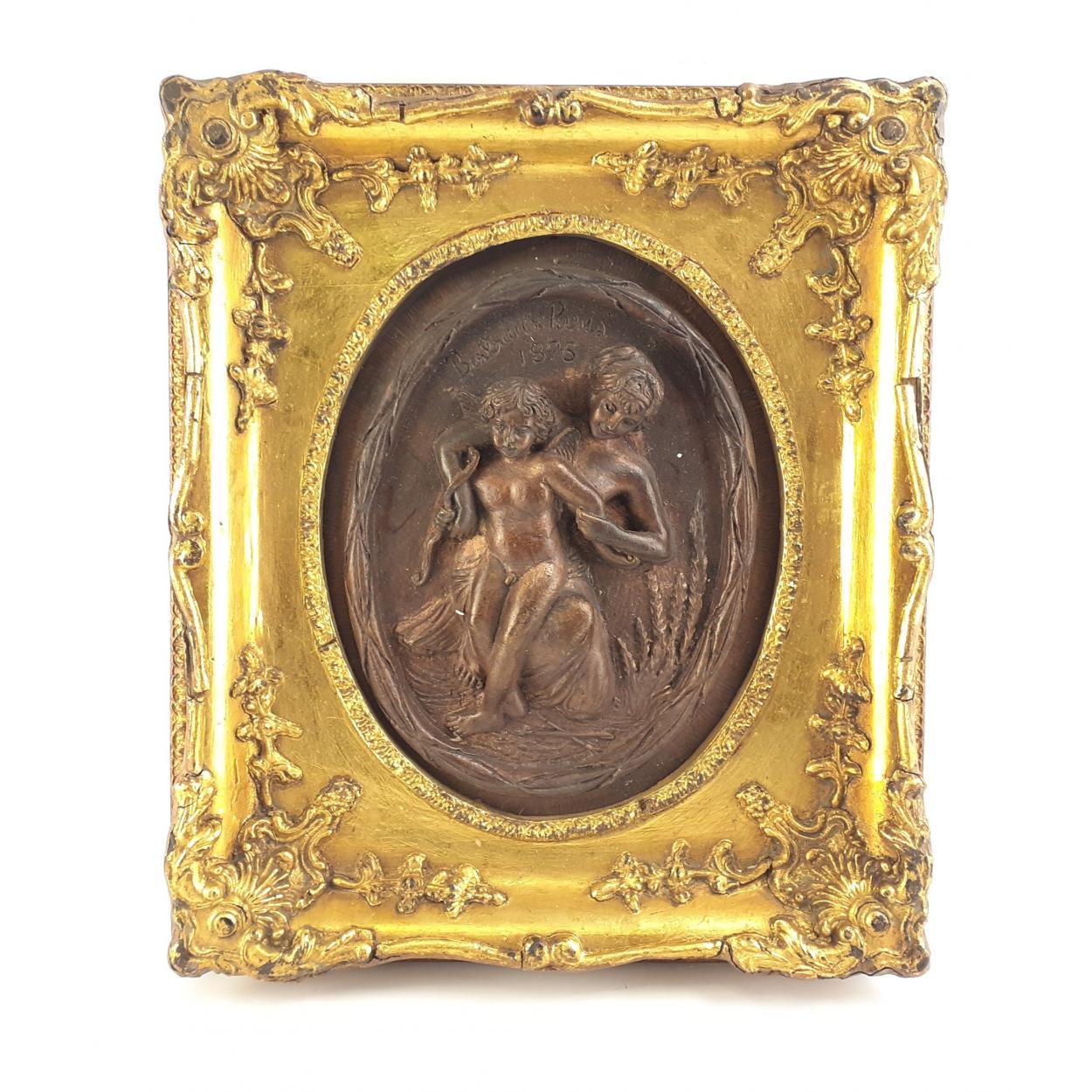 Cast medal plaque in ornate gilt wooden frame of woman with child. Plaque stamped Bertaux Paris 1875. 36cm x 30cm