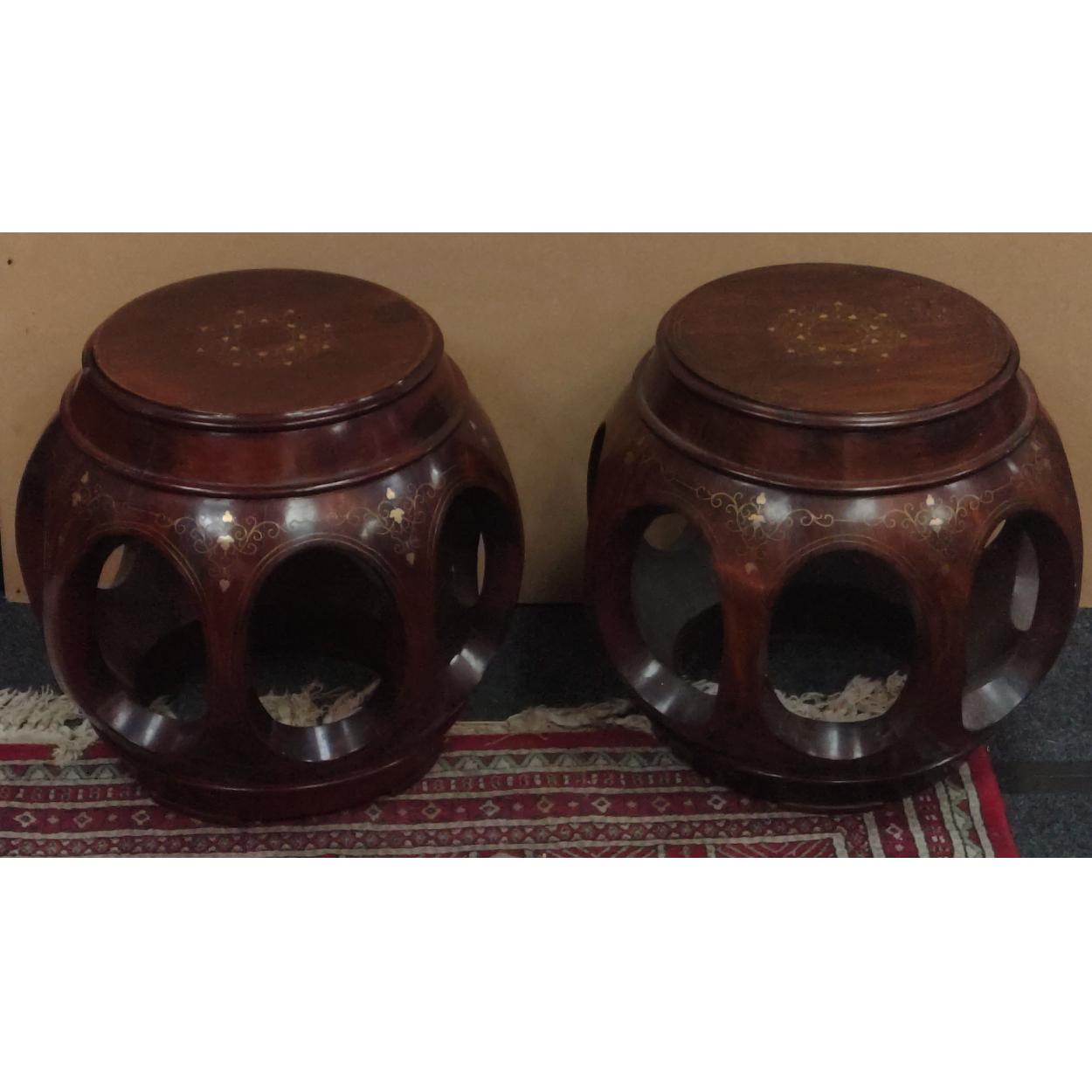 A pair of super little drum shaped inlaid small tables, each 40cm tall and in good used condition.