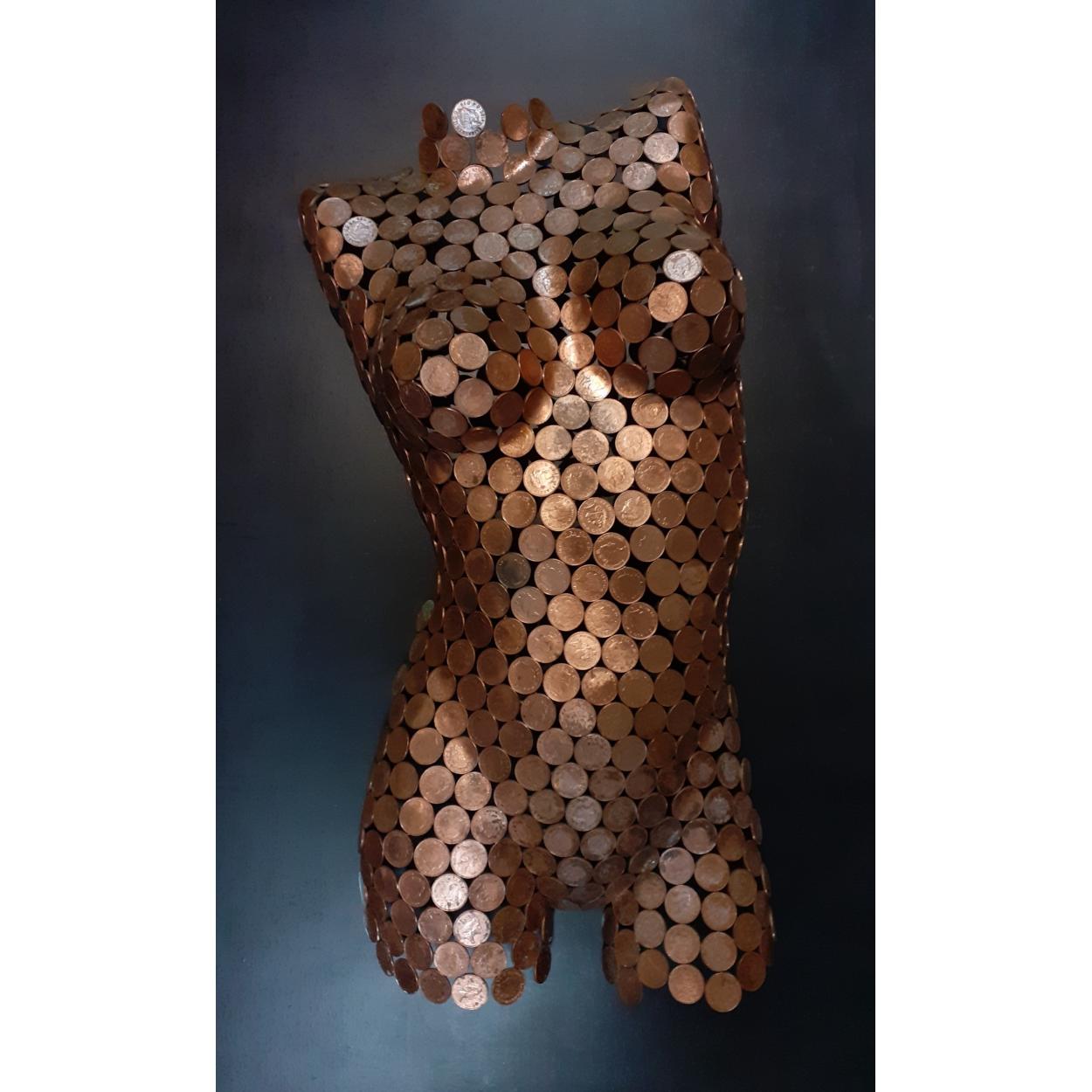An intriguing modern art wall piece of a female torso. Made entirely of 2p coins. Stands 70cm tall. A very unusual sculpure which displays superbly.