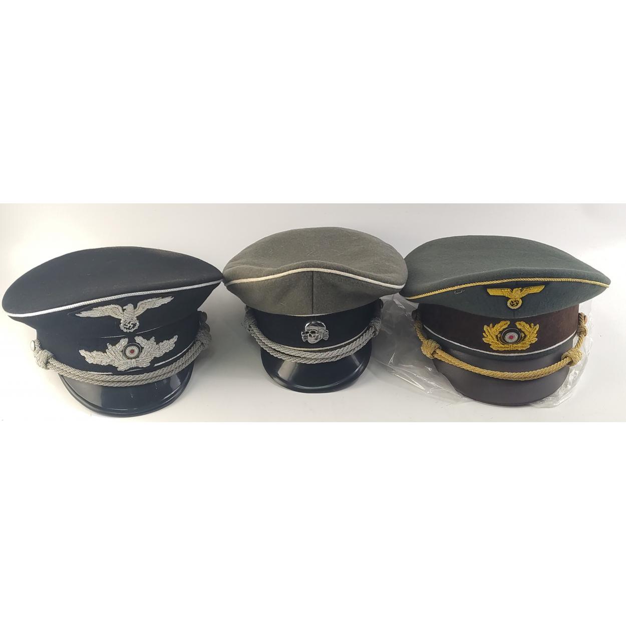 A collection of three great quality reproduction WWII German military Caps with insignia.