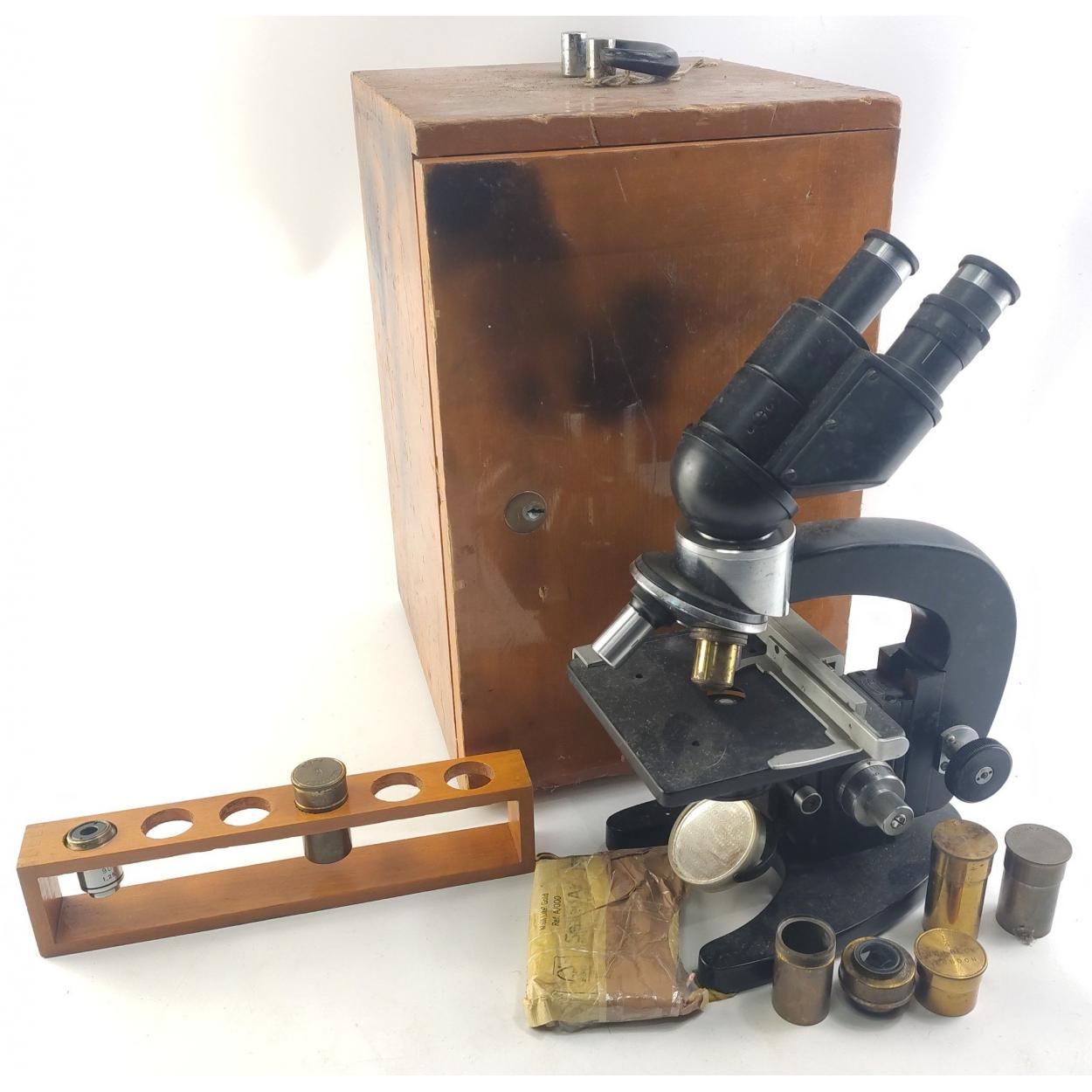 A vintage microscope in case with accessories.
