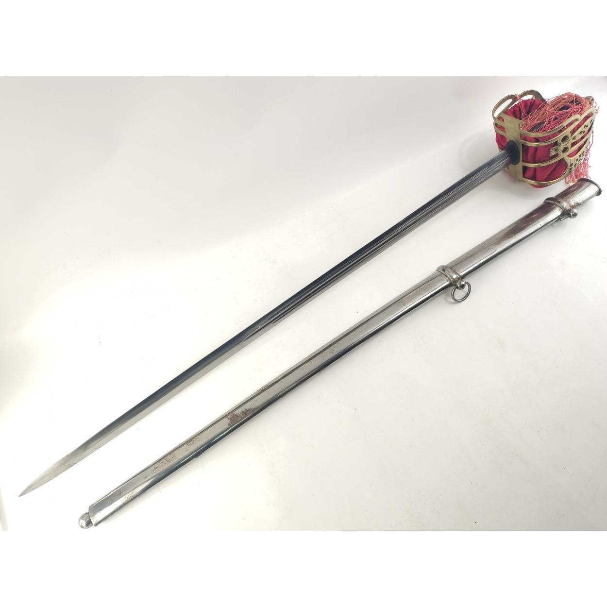 A repruduction basket hilt sword in metal scabbard 83cm blade in good condition.