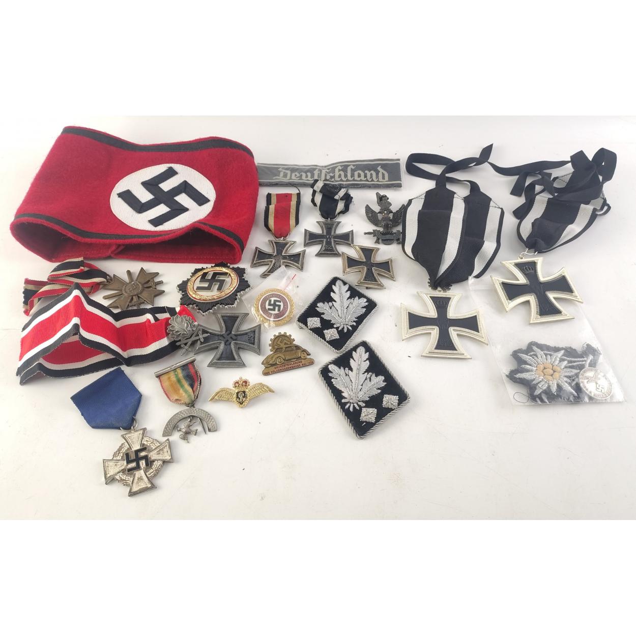 A quantity of WWII Third Reich reproduction Insignia, armbands, NSDAP coin and medals.
