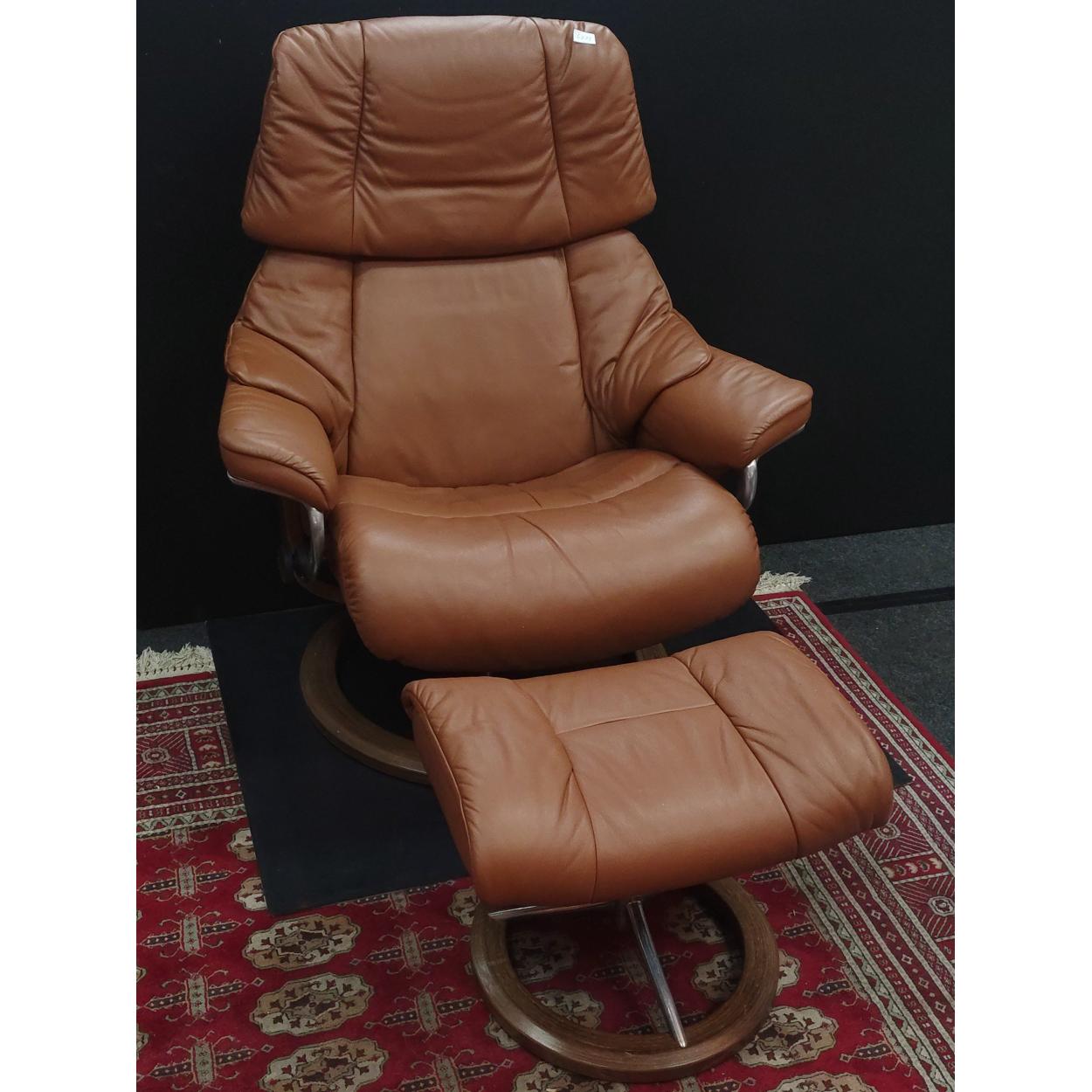 EKORNESS Stressless chair with foot stool. correctly labelled made in Norway. In light brown finish and in lovely clean useable condition