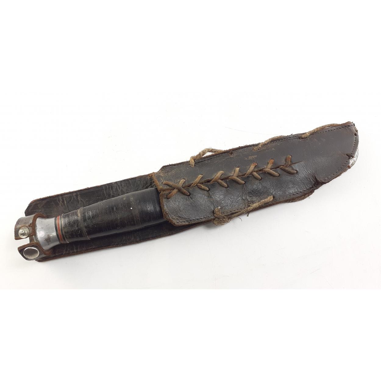 William Rodgers, I Cut My Way. Military style sheath knife in stiched leather sheath A/F. Knife handle with wear. 17cm blade