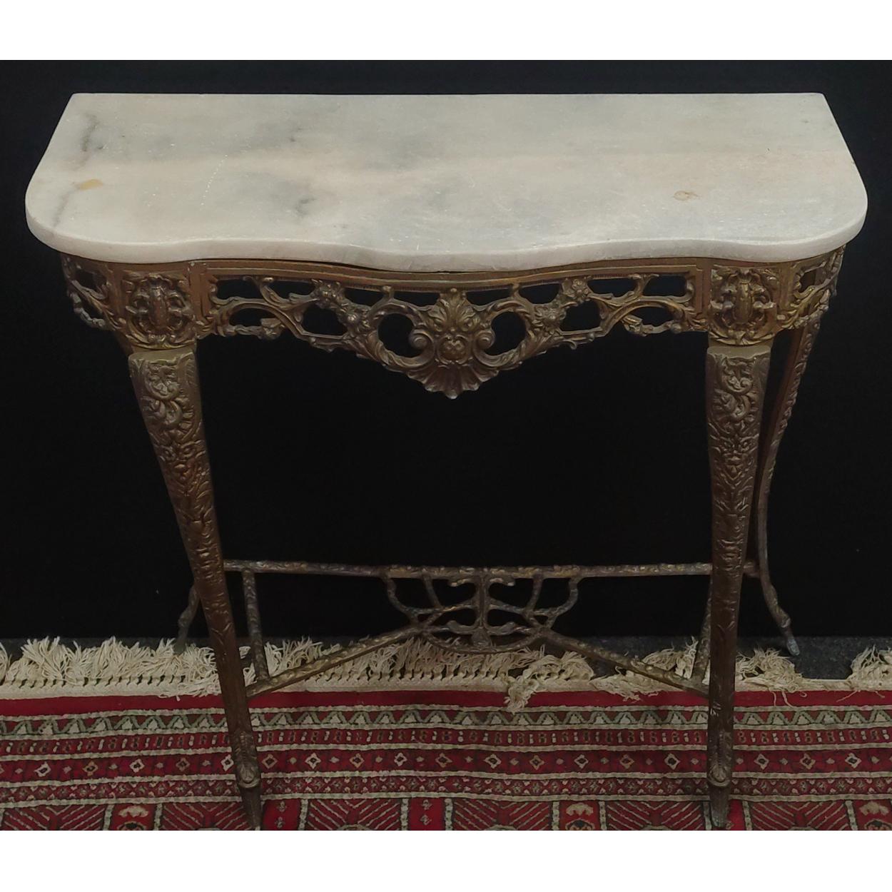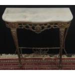 A marble topped hall console table. With ornate brass frame. 75cm wide, 34cm depth, and stands 70cm.