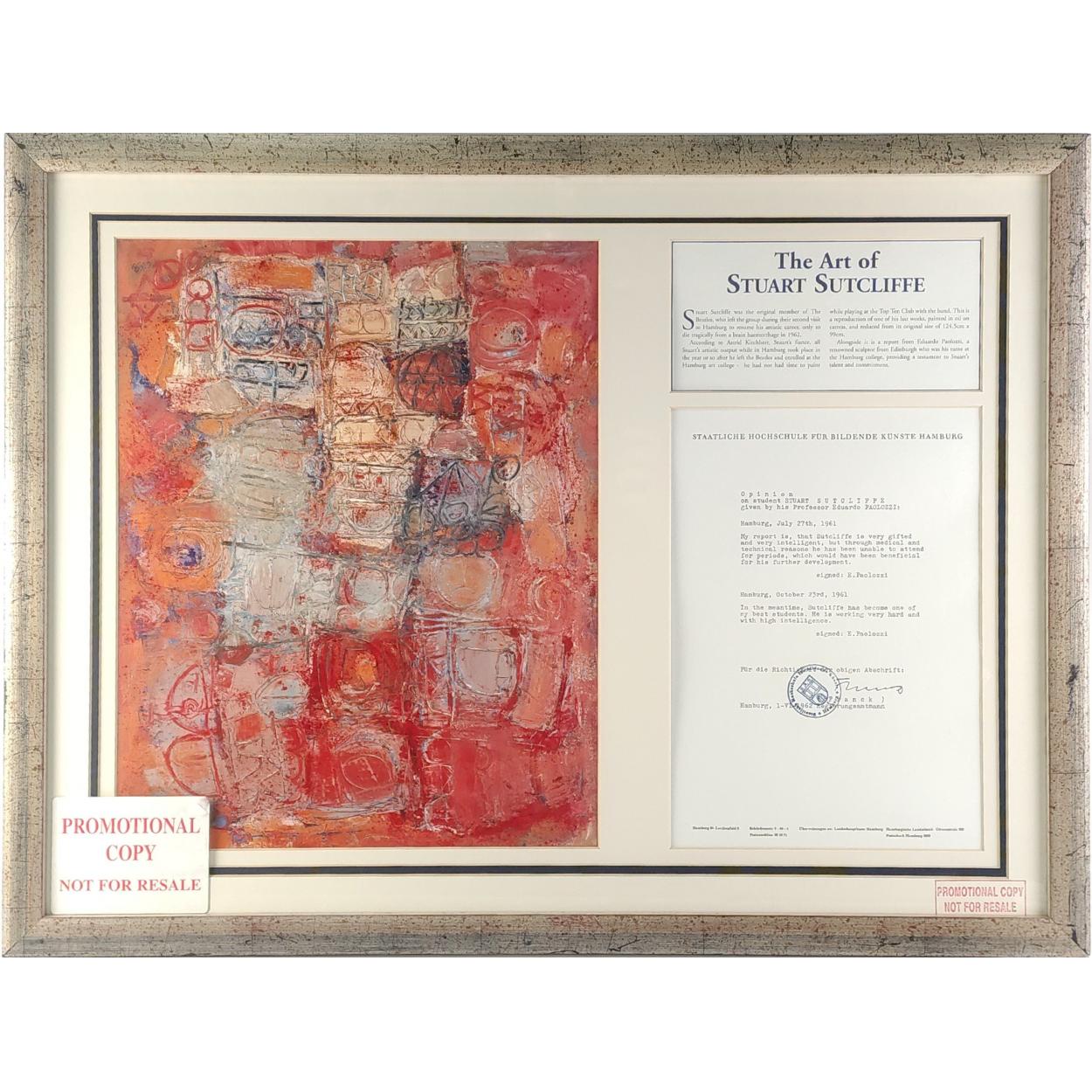 STUART SUTCLIFFE framed promotional print with certificate. A full production sample. Frame measures 71cm x 54cm. A superbly well presented piece, professionally framed with a copy letter by E. Paolozzi giving his opinion on Sutcliffes work. Interesting pieces of early Beatle related memorabilia